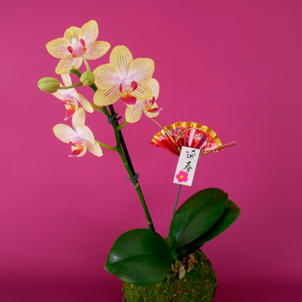 可憐なマイクロ胡蝶蘭「ゴールドベイビー」を苔玉に仕立てました。ビタミンイエローの花びらに赤いストライプが映える個性的な花色。花の中心に、まるで鳥が羽ばたくような姿が浮かび上がる、見る人を惹きつける魅力があります。受け皿付きで、そのまま飾れる手軽さも嬉しいポイントです。 ※個体差があることを、あらかじめご了承ください。