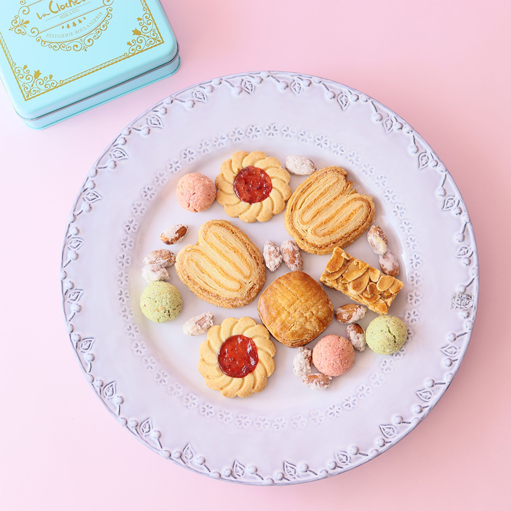 ガレット×2、パルミエ×3、フロランタン×2、サブレ・フレーズ×4、バーチ(苺×2、ピスタチオ×2)、プラリーヌ・オ・アマンド・サレ×10