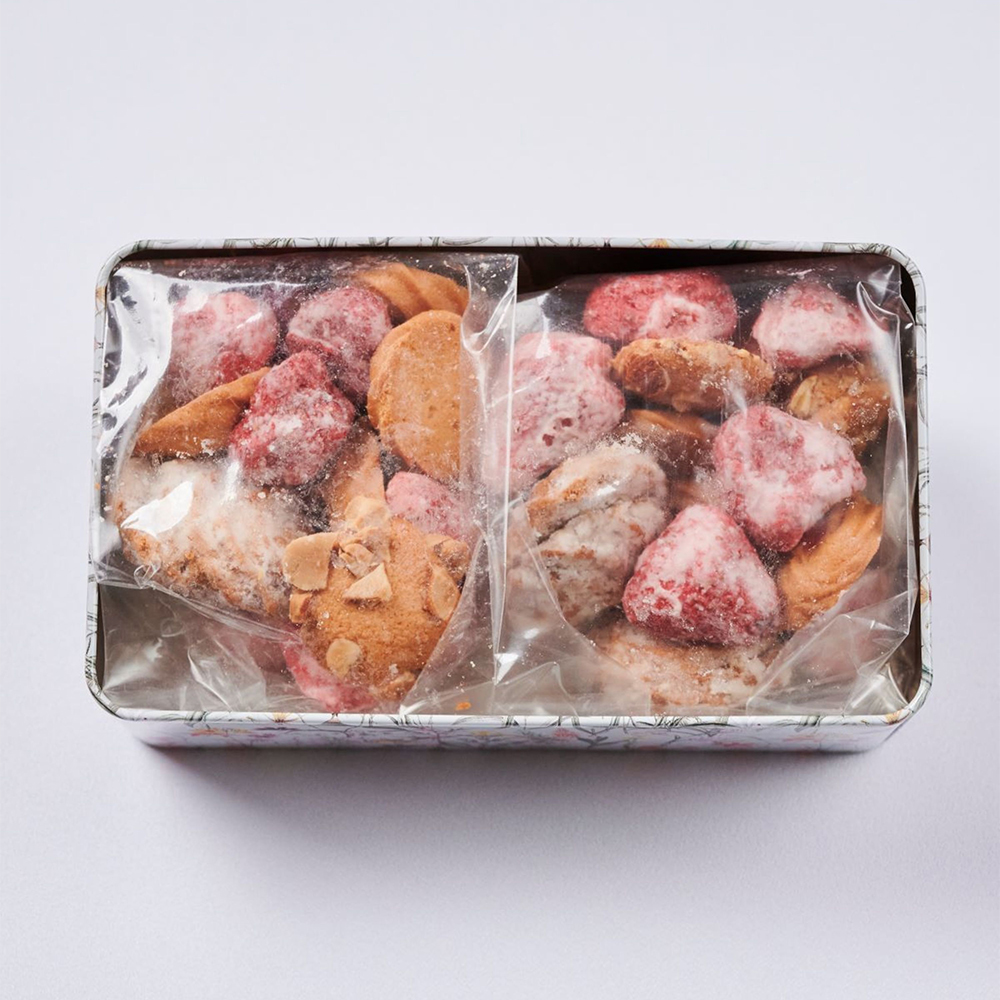 『ストロベリーショコラ』フリーズドライの苺にホワイトチョコレートをたっぷり浸み込ませた、苺の甘酸っぱさを贅沢に味わえるチョコレート菓子。『フラワーゲベック』シナモンの香りを効かせた、どこか懐かしさを感じる昔ながらのクッキーです。トップにはフランボワーズとアプリコットジャムをトッピング。1つひとつ丁寧に焼き上げています。『スパイスゲベック』アーモンドの粉を加えることでほろっ、サクッとした軽い食感が楽しめるクッキーです。ナツメグとシナモンの甘い香りが広がります。パウダーシュガーをたっぷりまぶした、見た目にも可愛いクッキーです。『アーモンドボール』卵白だけを使用した軽い食感のラングドシャ生地に、自家製の焼き割りアーモンドをまぶしたクッキーです。生地にもたっぷりアーモンドを練り込んでいるのでアーモンドの風味を存分に楽しめます。大きさの異なるアーモンドクラッシュがザクザクとした歯ざわりの良さを生み出します。