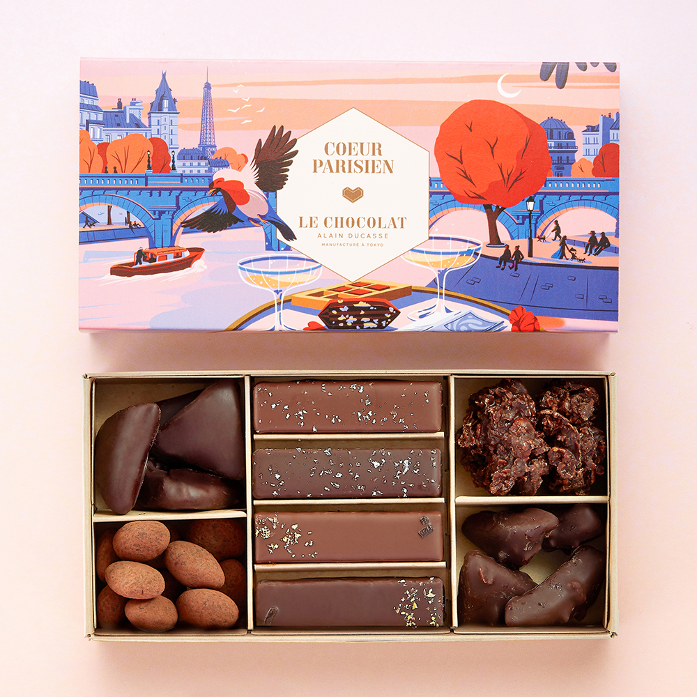 ル・ショコラ・アラン・デュカス自慢のショコラ5種:オランジェット、シトロネット、ドラジェ、ロック、ミニ・ブッシェのアソート。カカオの風味際立つショコラをバラエティ豊かに楽しめるバレンタイン限定BOXです。