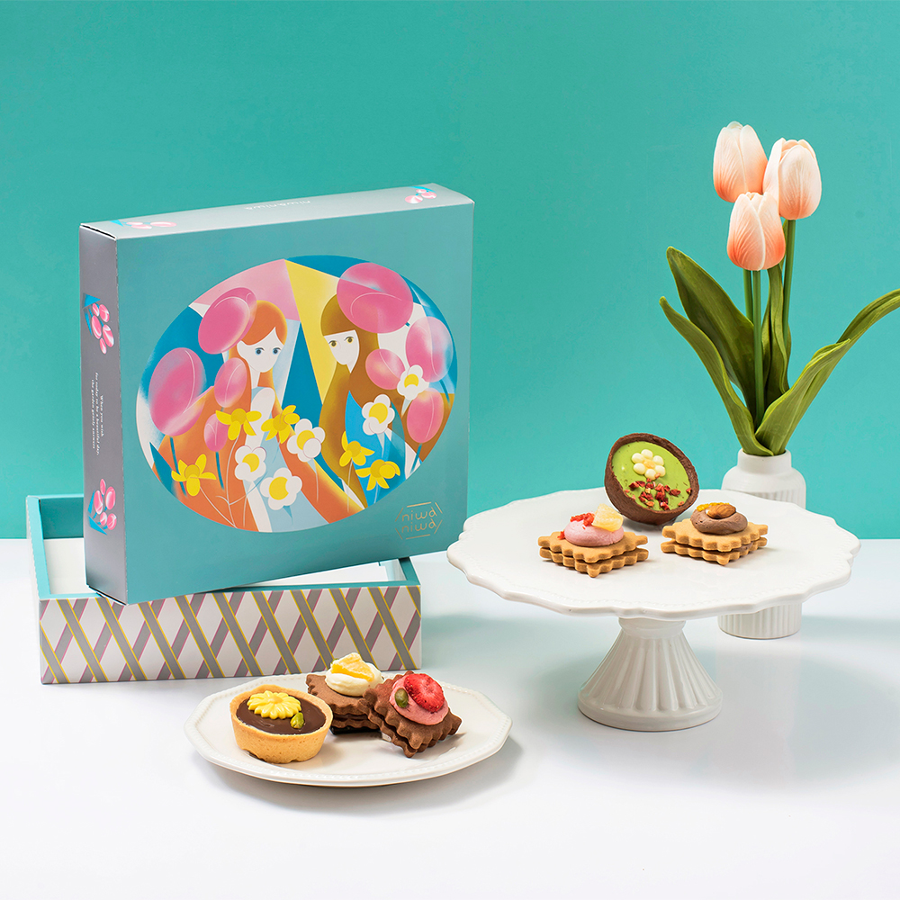 サブレサンド4種とタルト2種のアソート。さっくりサブレになめらかなショコラクリームなどを挟んだサブレサンドには、ドライフルーツやナッツをトッピング。サクサク食感のタルト生地にしっとりとした生地を入れて焼き上げたタルトは、仕上げにチョコレートで彩りを添えました。どちらも花壇をイメージしたトッピングで華やかに仕上げています。