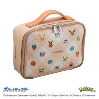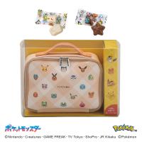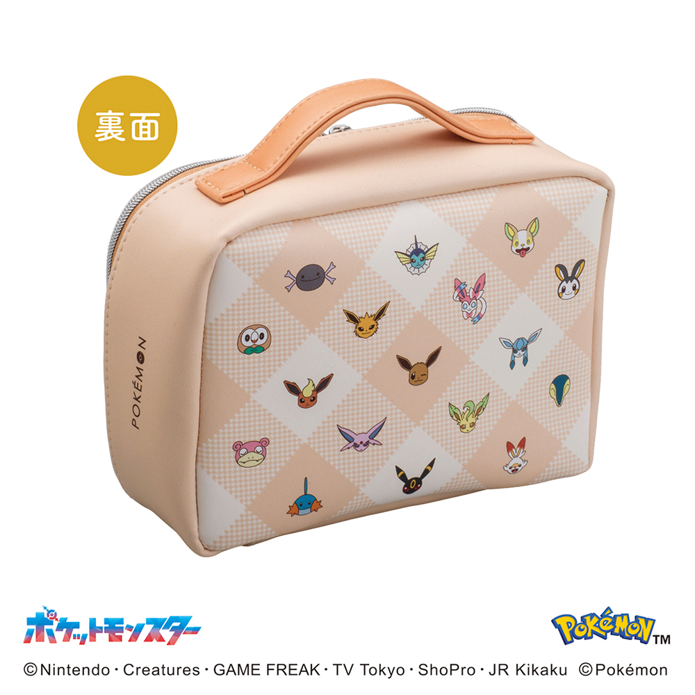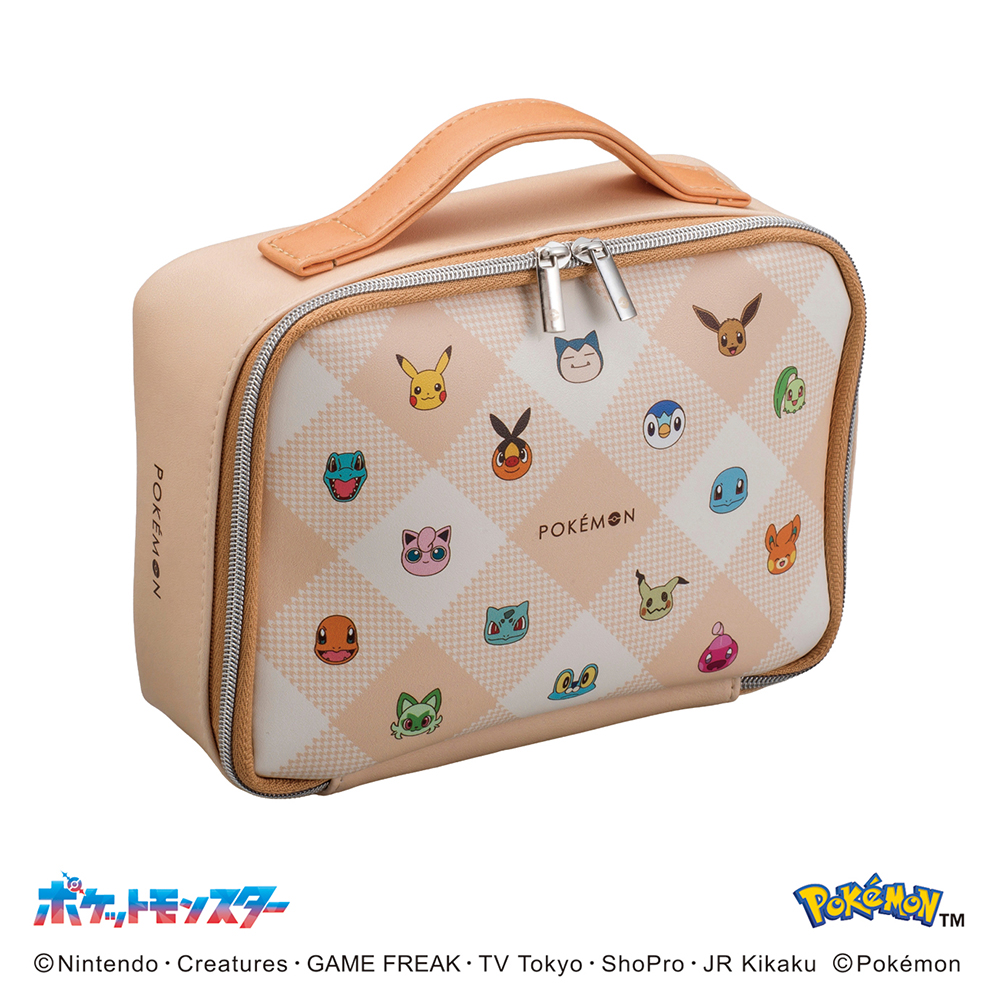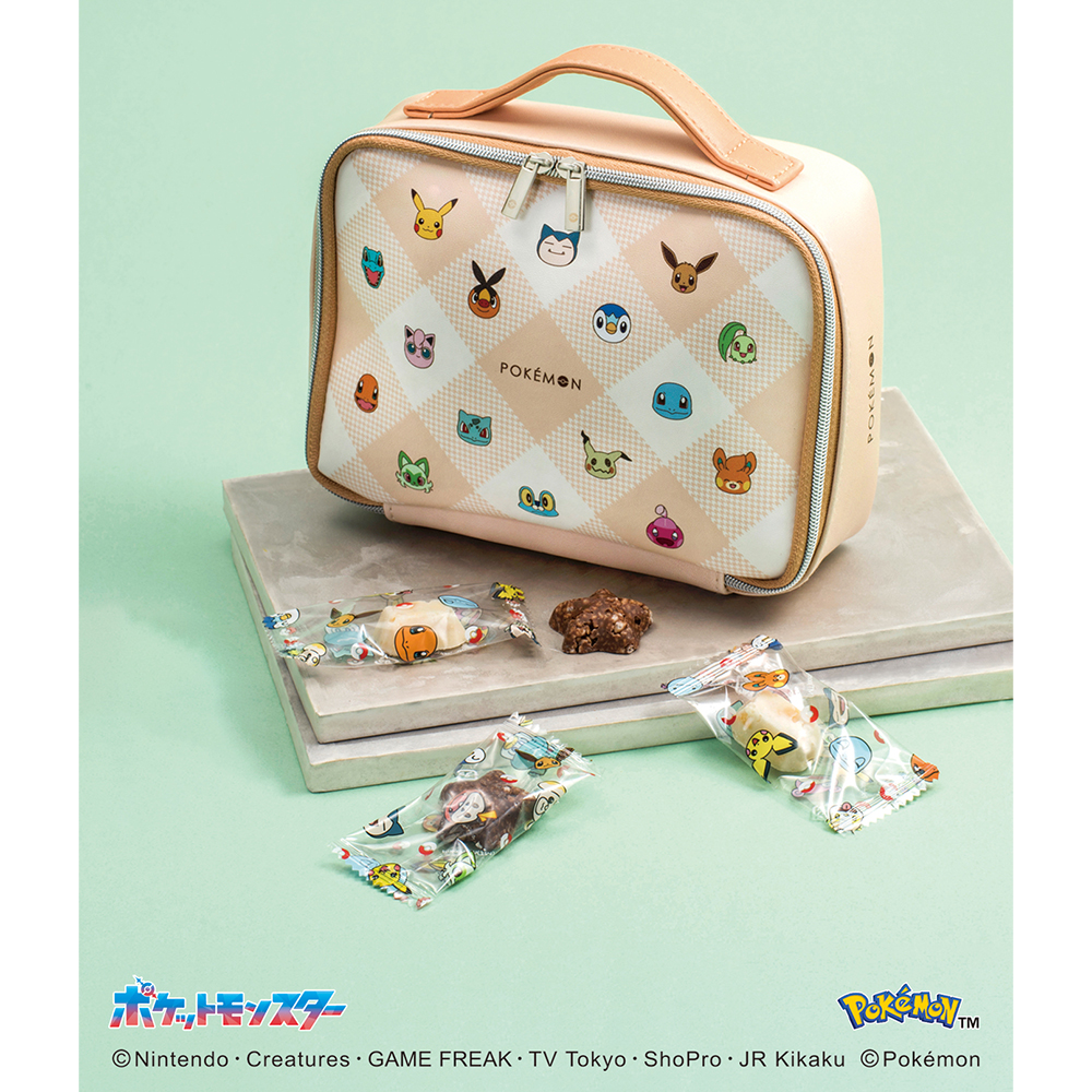 たくさんのポケモンたちをちりばめたデザインのバニティポーチとお菓子のセットです。