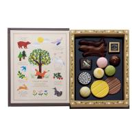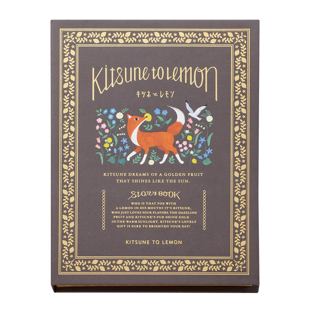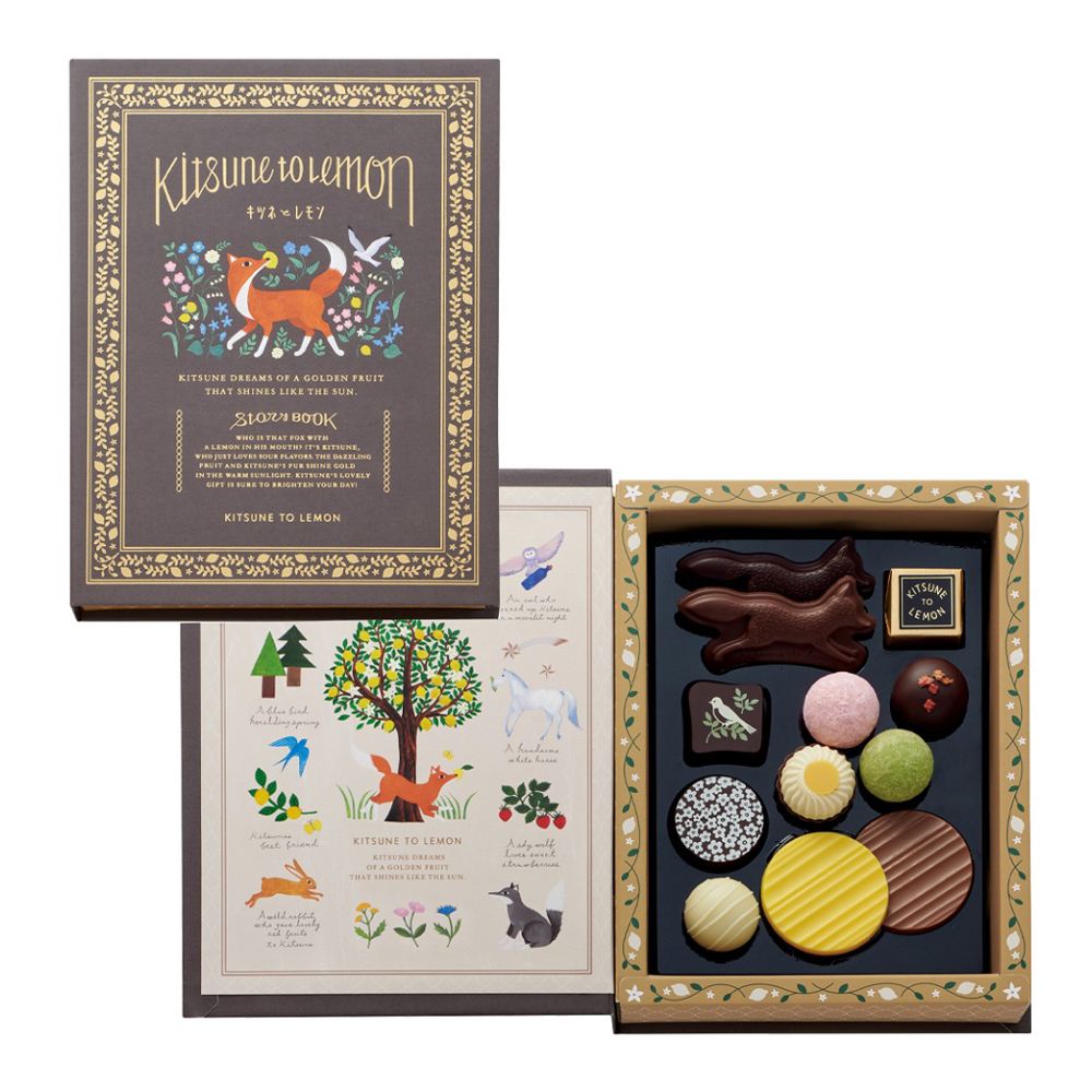 「キツネとレモン」のイラストを楽しめる絵本のようなパッケージとチョコレートで新登場。可愛らしいキツネのかたちのチョコレートや、オオカミのお気に入り(あまおういちご)、森のくまのとっておき蜂蜜(レモンの花蜂蜜)、野うさぎの赤い実(いちご)、ハンサムな馬の葉っぱ(レモングラスフレーバー)、フクロウのお酒(リモンチェッロ)などのチョコレートを楽しくアソートしました。表紙全面に繊細な箔押しデザインを施した、印象的な本型パッケージです。<ブランド説明>「あるときキツネがレモンをくわえてやってきた」すっぱいもの好きの、ちょっと変わったキツネが届けるキュンととろける甘酸っぱさ。心を明るく灯す、黄金の実「レモン」にまつわるお菓子。