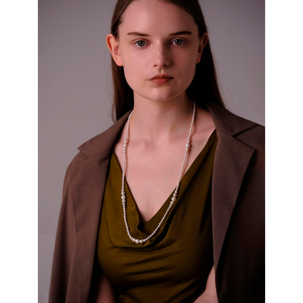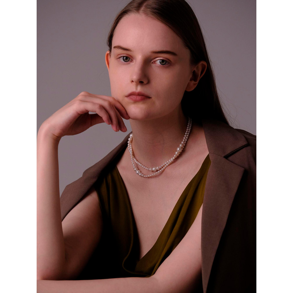 パールの大きさをグラデーションに配置し、太さに強弱をつけたネックレス。きちんと感を保ちつつ、優しいウェーブラインがフォーマル感をやわらげ、普段使いしやすい親しみを備えた仕上がりに。2連にして首元にボリュームをつけた着こなしもおすすめです。
