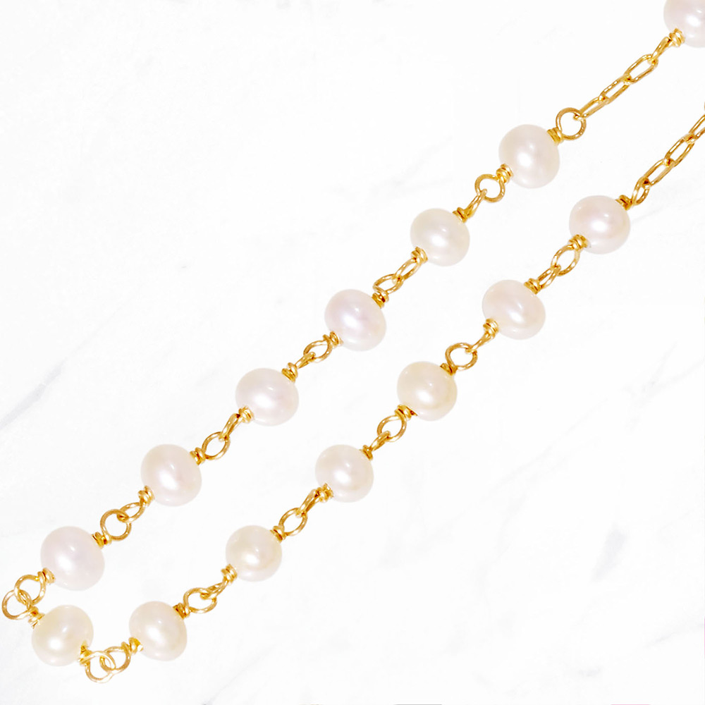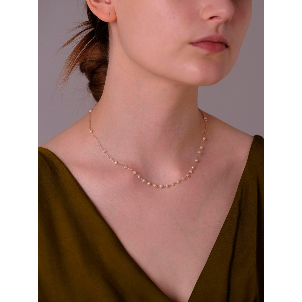 ベビーパールを繊細なチェーンとリズムよく繋げ仕立てたショートネックレス。ストレスフリーな軽い付け心地で、デイリーな装いからオフィススタイルまで幅広く活躍してくれるアイテムです。規則正しく丁寧なワイヤーワークを駆使したお作りで、シンプルな中に気品を感じる仕上がりに。