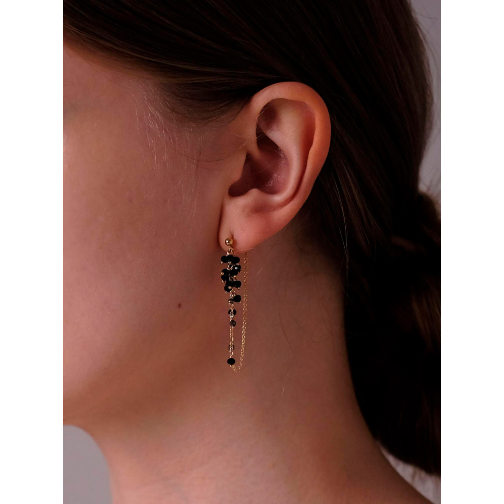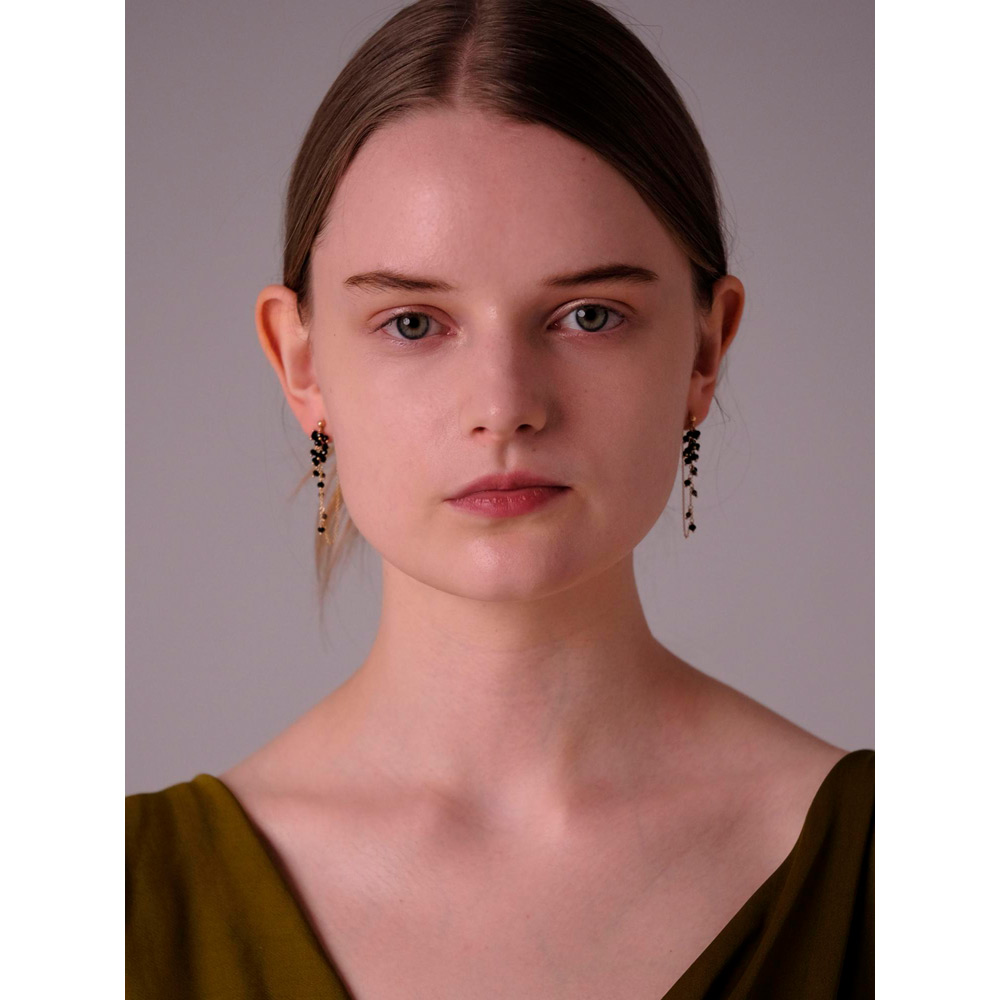 マルベリー ( 桑の実 ) をモチーフにしたピアス。キレのある硬質な輝きが魅力のブラックスピネルをふんだんにあしらったクールな華やかさを持つアイテムです。耳元からのサイズグラデーションが可憐な印象。ピアスキャッチに繋がるチェーンが耳元をふわっと包み込み、モード感と優しさを併せ持つ独特の雰囲気が魅力です。