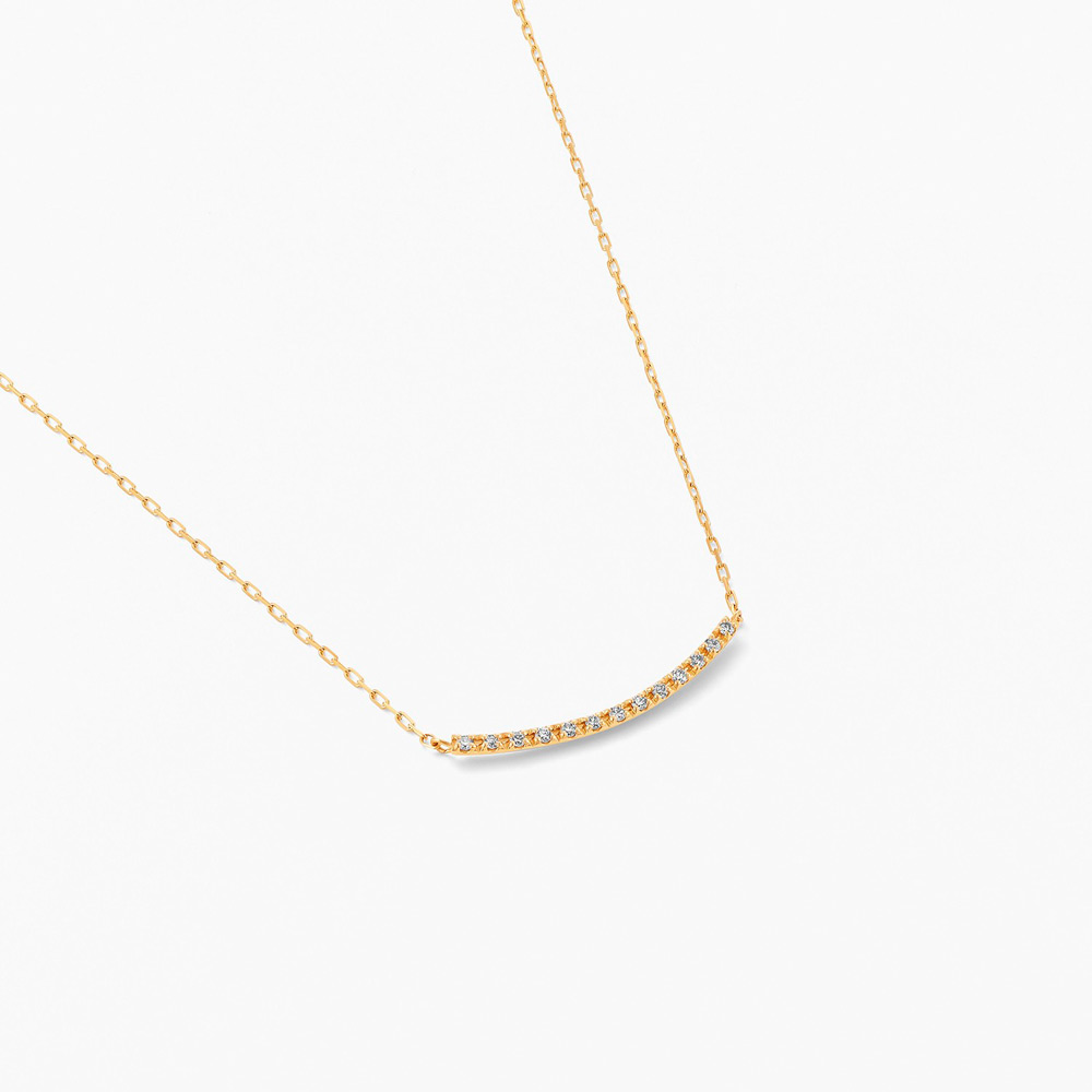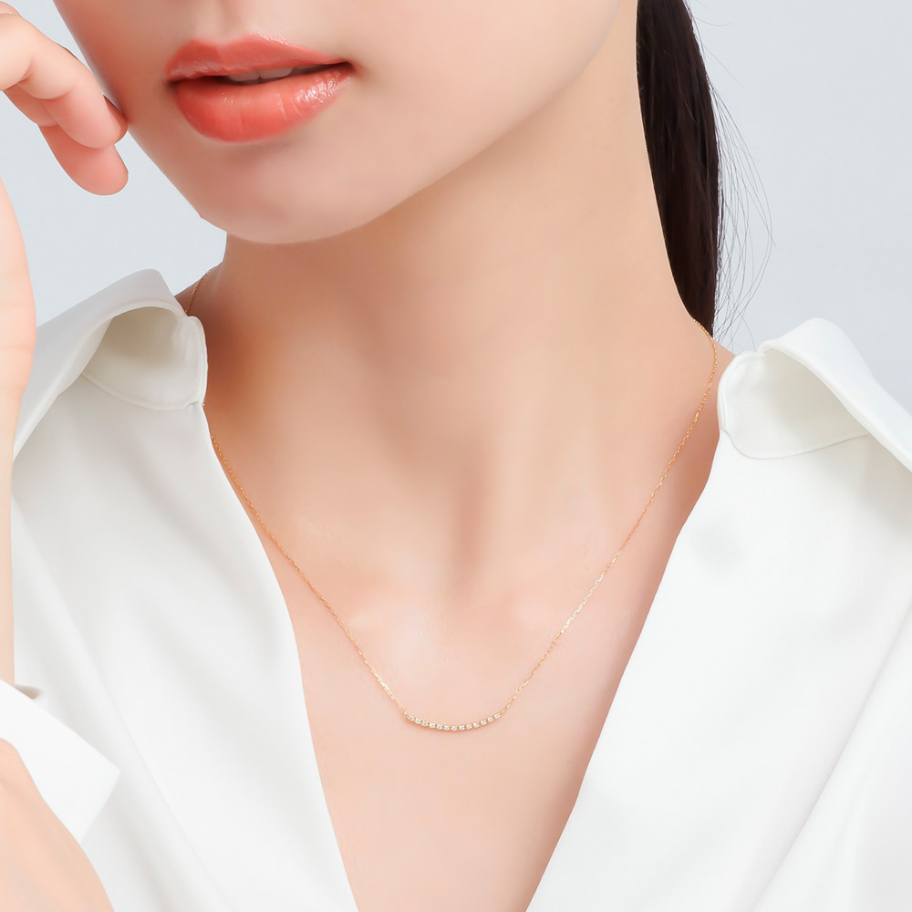 レール状のフォルムがモダンな印象を与え、こなれた雰囲気を演出します。ダイヤモンドは、Hカラー、SIクラスのクラリティ、Goodカット以上の品質の中から厳選し使用。極小サイズの爪が上質なダイヤモンドの輝きを引き出し、デコルテに上品な華やかさを与えます。背面はツヤ感が美しい地金の仕立てに。装いや気分に合わせてリバーシブルで楽しめるため、コーディネートの幅を広げてくれます。スライド仕様のチェーンのため、トップスに合わせて長さの調節も可能。ダイヤモンドの存在感に負けない線径のチェーンを採用することで、高級感のある仕上がりにこだわりました。シンプルなデザインだからこそ、永く愛せるクオリティとデザイン、日々に寄り添う使いやすさを追及したネックレスです。