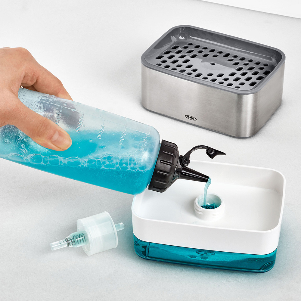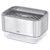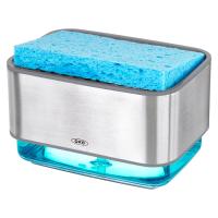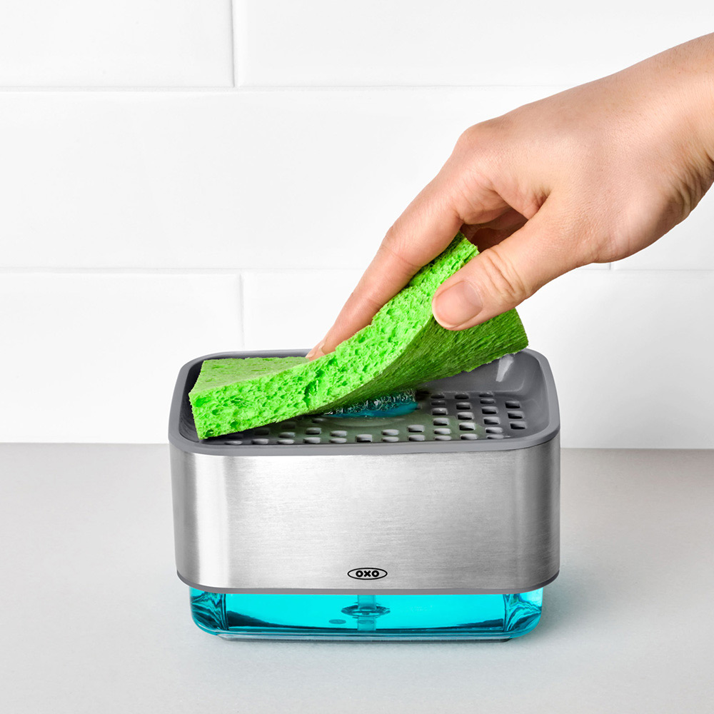 スポンジホルダーとソープディスペンサーの2役をこなすのが、このスポンジホルダー(ソープディスペンサー付)です。上部は水切りトレイが付いたホルダー(スポンジ置き)、下部はプッシュ式のディスペンサー(洗剤入れ)で、スポンジを乗せて上からプッシュするだけで洗剤がつけられます。トレイにたまった水は簡単に捨てられて、いつでも清潔です。洗練されたデザインで狭いシンク周りでもすっきり置けます。透明の容器は洗剤の残量が一目でわかります。