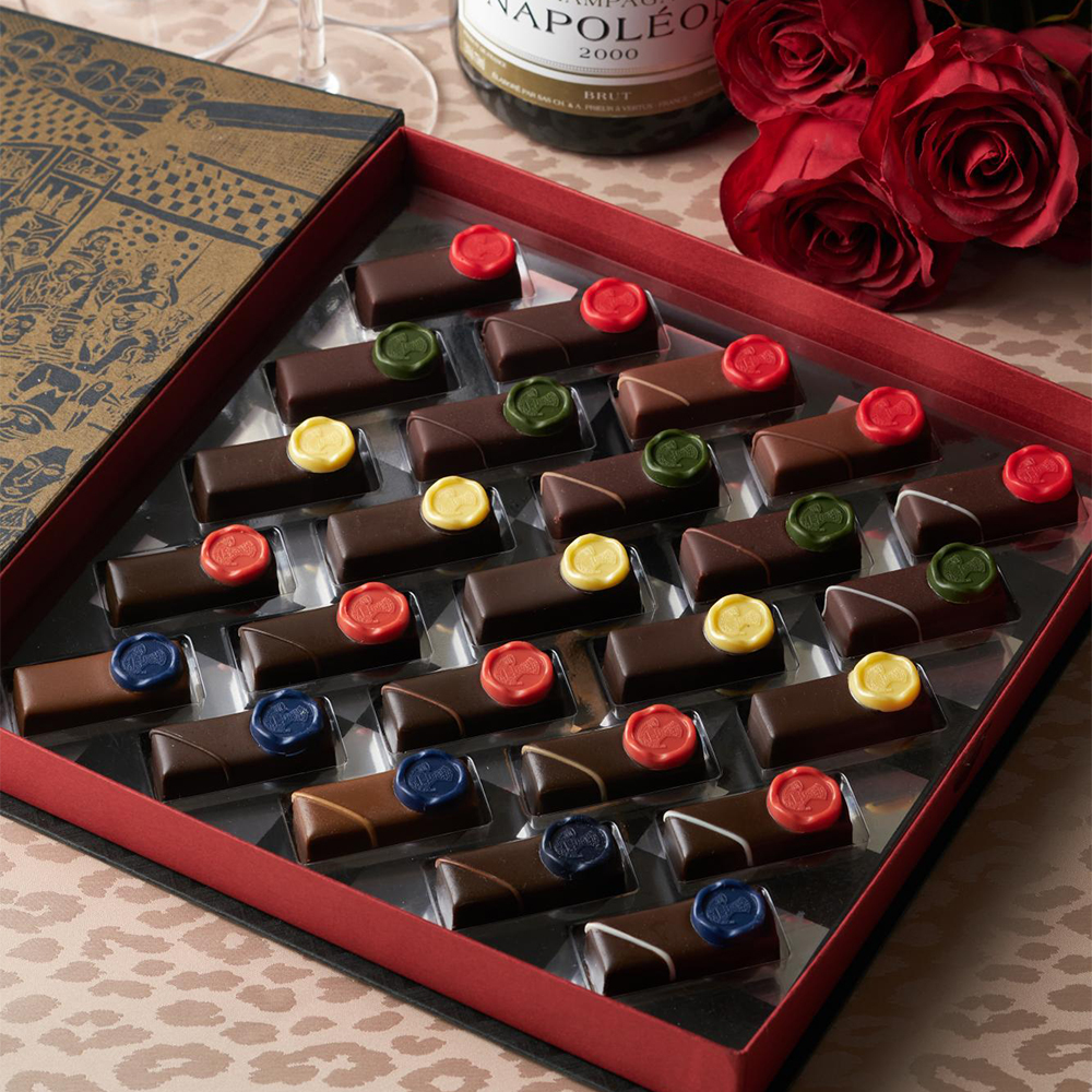 華やかなパーティーのお手土産や特別な贈りものに喜ばれる、贈る人のセンスをワンランクアップさせる一箱。男性の小物をイメージした箱の中には21種25個のボンボンショコラがチェス盤イメージのパッケージの上に華やかに並んでいます。箱を開けた瞬間の視覚の感動と、心地よいショコラの香り。そのまま置いておくだけで華やかなひとときをお楽しみいただけます。「素材を活かしてシンプルに」「ひと手間を加えて美味しさを引き出す」をテーマにしたJOHN KANAYAのボンボンショコラは、「バランス」にこだわり、一つ一つ合わせるクーベルチュールやレシピを変え、職人が作っています。JOHN KANAYAの定番のボンボンショコラ「スタンダード」「酒」「和」「果実」の4ライン20種のフレーバーに、金谷鮮治が愛飲していたシャンパーニュ「ナポレオン」5個をプラスしたアソート。