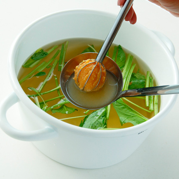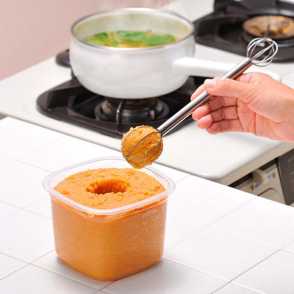 大小の丸い計量部を味噌に差してくるりと回すとカンタンに味噌の計量ができます。大は約大さじ2、小は約大さじ1の計量ができるので、毎日の味噌汁が、簡単に、一定の味付けで作ることができます。味噌を計量したら、そのまま味噌溶きとして使うことができます。卵溶きや調味料を混ぜる時にも便利に使えます。収納しやすいコンパクトサイズ。