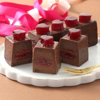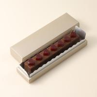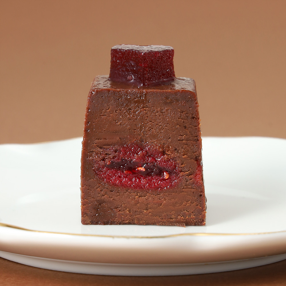 オーブンでゆっくりと湯煎焼きにしたテリーヌは、まるで生チョコレートのようになめらかな食感です。焼きあがってから24時間冷蔵庫で熟成させます。そうすることで生地が落ち着き独特の食感が生まれます。すっきりとしたベトナム産のカカオ62%のチョコレートをベースに、さらにカカオの味わいを強調するためにカカオマス(カカオ分100%のチョコレート)を追加しました。アクセントとして甘酸っぱいラズベリーマカロンを入れて焼き上げています、しっとりとしたマカロンの風味とラズベリージャムがチョコレートとよく合います。仕上げにラズベリーゼリーを添えていますので、味の変化をお楽しみください。ユニークな形の断面が目にも楽しいスイーツです。