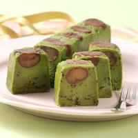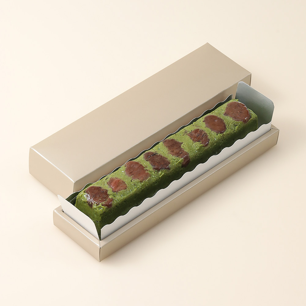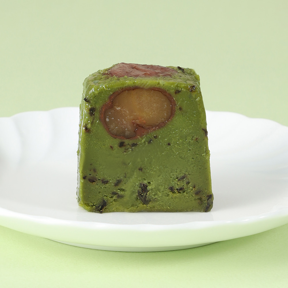 オーブンでゆっくりと湯煎焼きにしたテリーヌは、まるで生チョコレートのようになめらかな食感です。焼きあがってから24時間冷蔵庫で熟成させます。そうすることで生地が落ち着き独特の食感が生まれます。抹茶の香りを引き立たせるために、甘さ控えめのホワイトチョコレートを使用しました。抹茶には宇治の手摘み抹茶のみを使用し、お茶の旨味を感じていただけます。さらに抹茶の原料となる「碾茶」をふんだんに練りこみました。(碾茶は基本的に、抹茶に加工されるため市場には出回らないものですが、テリーヌの為に茶農家から直接仕入れ使用させていただきました。)茶葉の状態で使用することで、抹茶本来の旨味が染み出し、今までにない抹茶スイーツの風味をお楽しみいただけます。