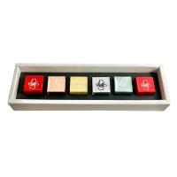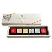海塩とオリーブオイルを使用した「アル・サーレ」、コーヒー豆を粗挽きし本場のカプチーノを再現した「アル・カプチーノ」、ヘーゼルナッツ好きにはたまらないヘーゼルクリームをサンドした「クラシコ」、海塩を使いキャラメルをイタリア風にアレンジした「アル・カラメッロ」、日本限定商品「ドッピョストラート」は下層にビタージャンドゥーヤを使用し、上層はホワイトチョコレートの中にキャラメッラートされたヘーゼルナッツをちりばめ大人のチョコレートに仕上げました。6粒入りアソートセット。