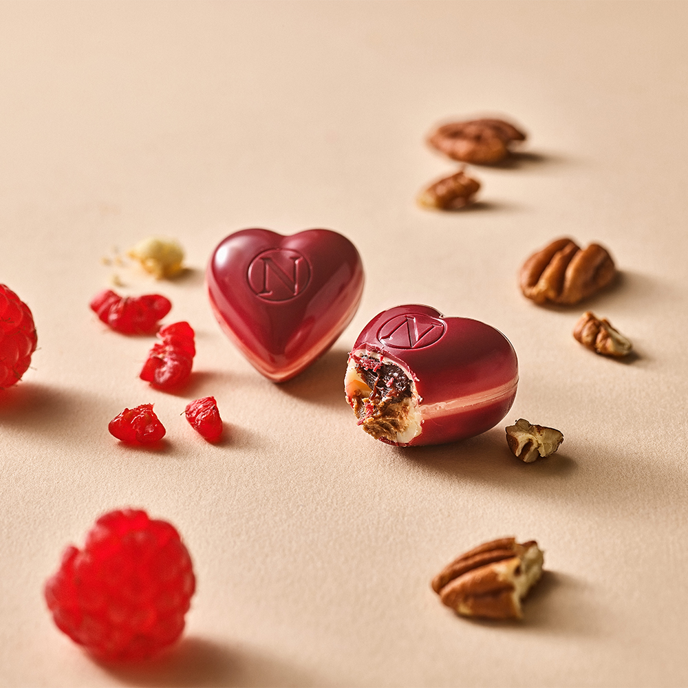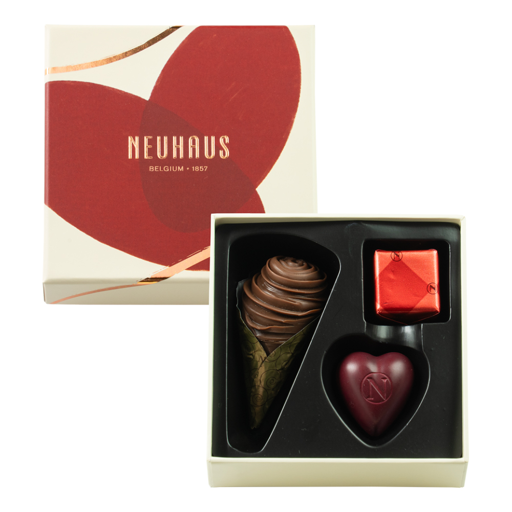 2026年限定のレッド ハートと、ノイハウスの定番チョコレートを詰め合わせた3個入り。洗練された味わいをカジュアルに楽しめる、日本限定のアソートです。バニラ香るビスケットとピーカンナッツのプラリネを重ねたレッド ハートが、華やかな印象を添えます。