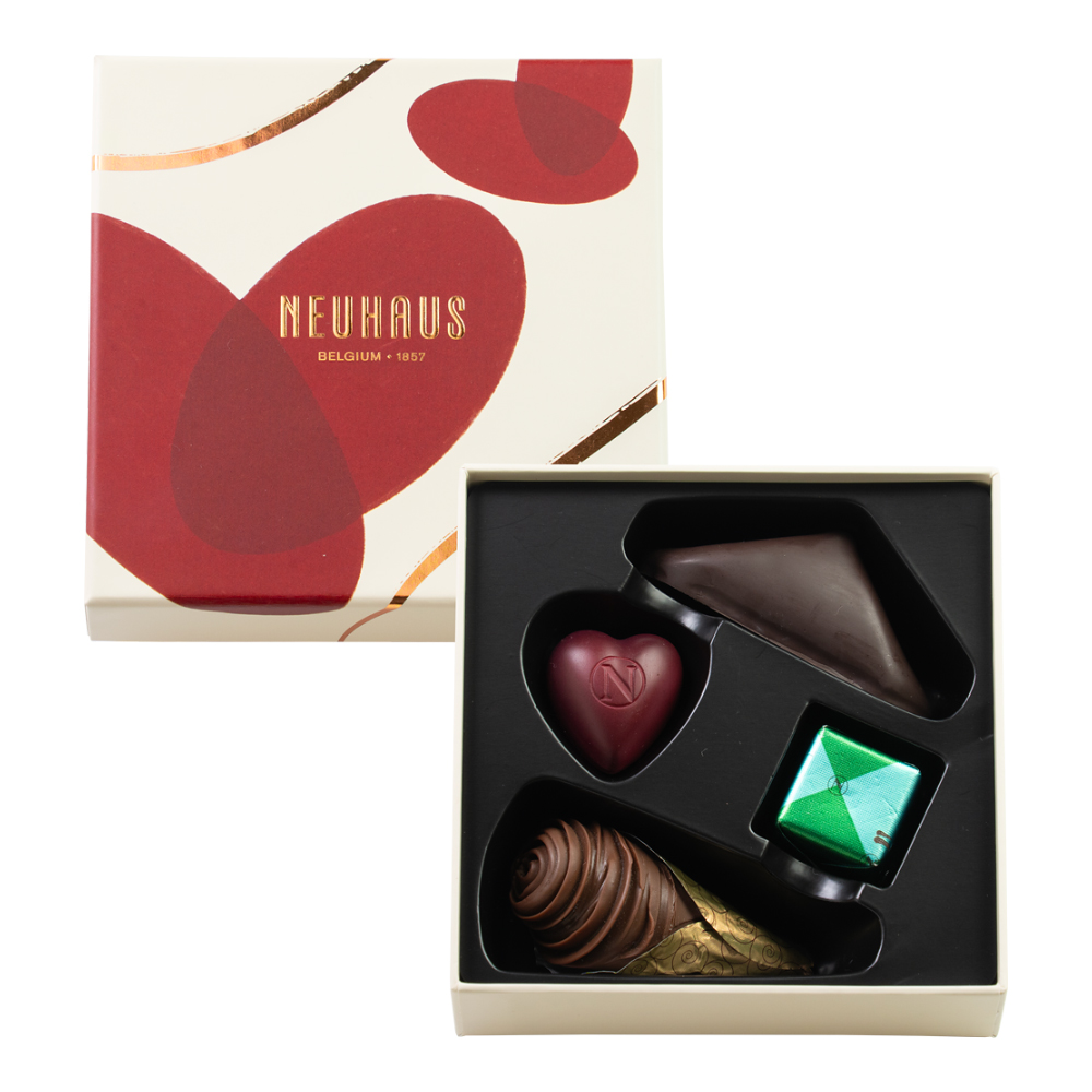 ノイハウスを代表するチョコレートに、2026年限定レッド ハートを加えた4個入り。贈りものにふさわしい、一粒ごとに上質な余韻が広がる日本限定アソートです。ノイハウスのアイコンでもある「カプリス」は、マダガスカル産バニラとヌガティーヌが織りなす贅沢な一粒です。