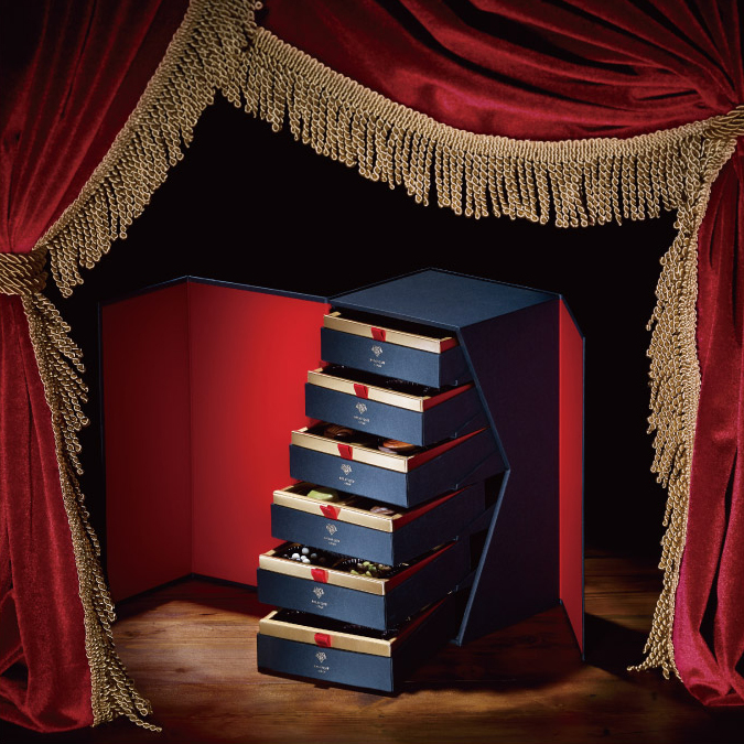重厚感溢れる6段のシグネチャーボックス。新作から定番まで全てのショコラがアソートされた、ピエール・ルドンの手から創り上げる世界観が余すことなく堪能できる一箱。