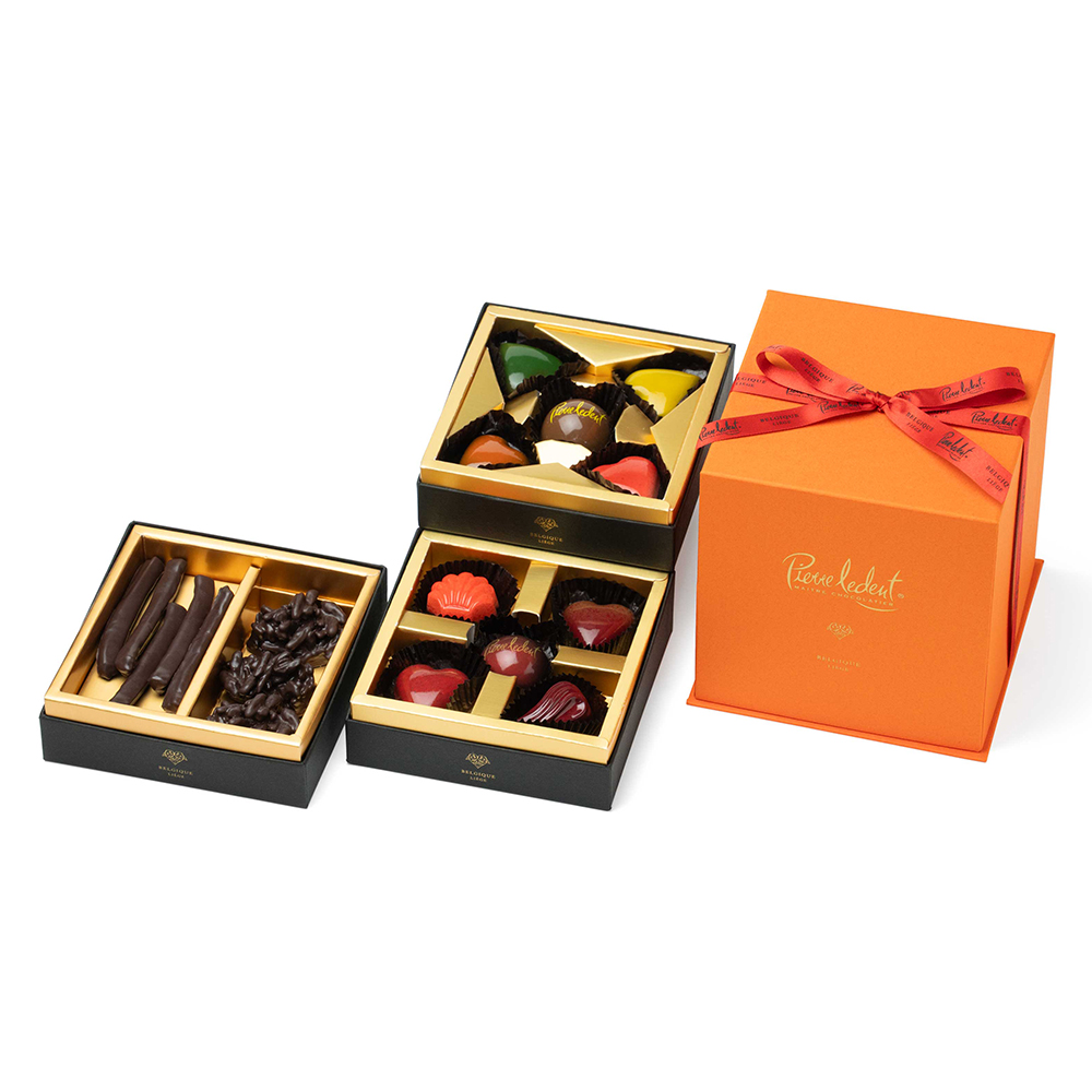 オレンジの3段ボックスは毎年多くの方に愛されるピエール・ルドンの大定番。今年はピエールのストロベリーコレクションもしっかりとアソート。新作からロシェ&オランジェットまで思い切り欲張って。