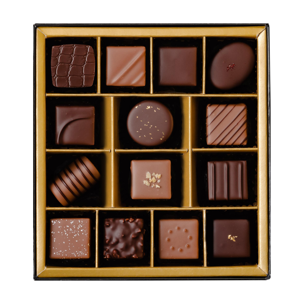 14粒入(フィアンティーヌ、ハーゼル、ピスターチ、ヒンビアー、マローネン、マンデル、ラム、ベルガモット、デメル、カラメル、ミルヒ、ココス、シュバルツァーティー、オランジェン)