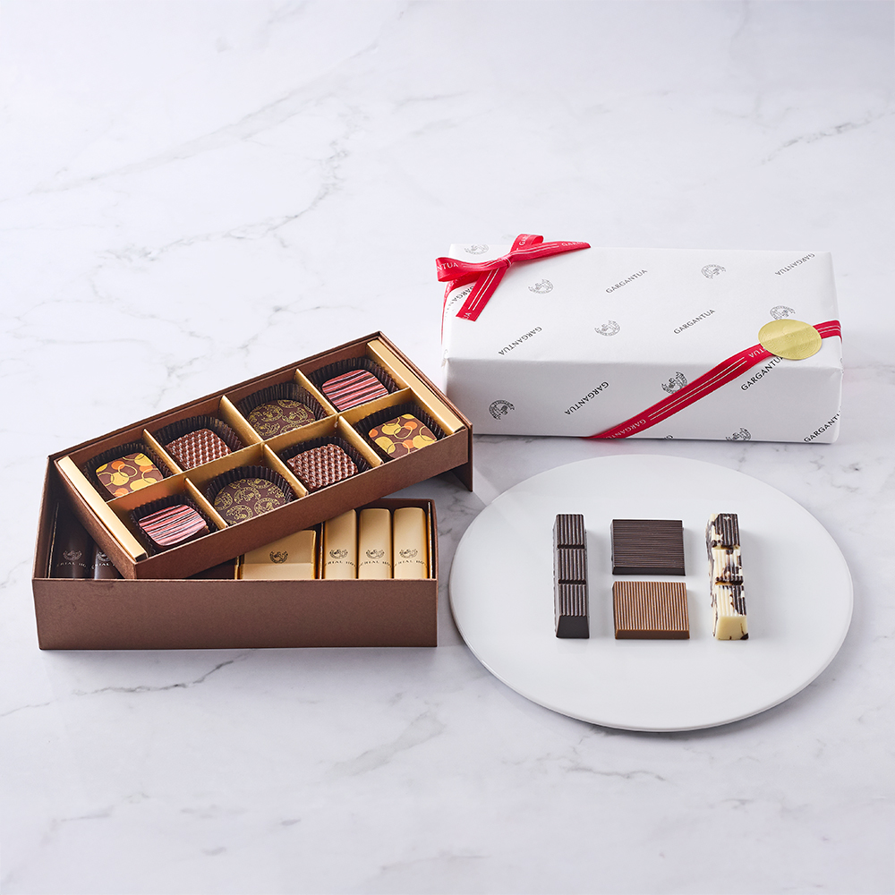 素材の風味を活かしたひとくちサイズのチョコレートとプレート型、スティック型のチョコレートの詰合せ。