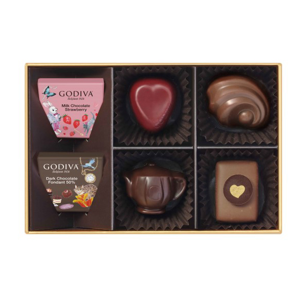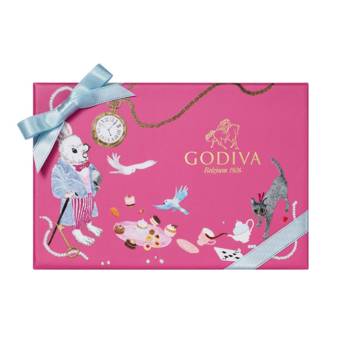 ティーパーティを彩る紅茶をイメージしたチョコレートやゴディバの100周年を記念してリニューアルされたハート形のチョコレート、シーズン限定カレなどを、物語のシンボルのトランプやティーセット、白うさぎなどを描いたパッケージに詰め合わせました。
