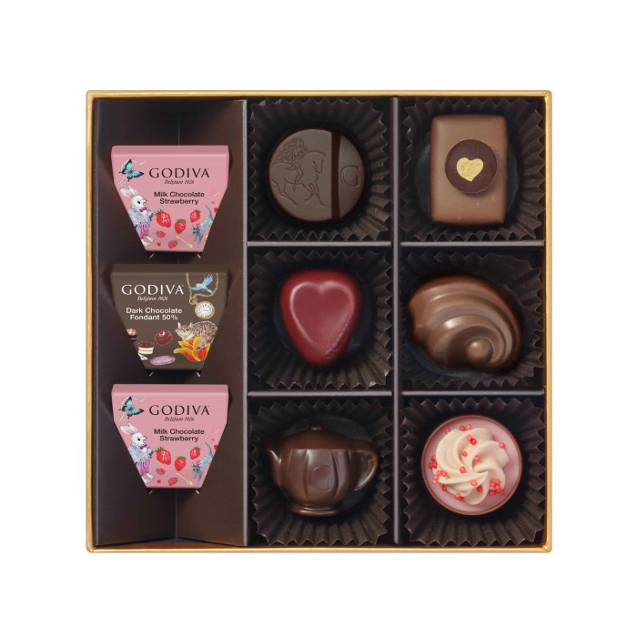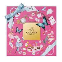 ティーパーティを彩る紅茶をイメージしたチョコレートやゴディバの100周年を記念してリニューアルされたハート形のチョコレート、シーズン限定カレなどを、物語のシンボルのトランプやティーセット、白うさぎ達をちりばめたパッケージに詰め合わせました。