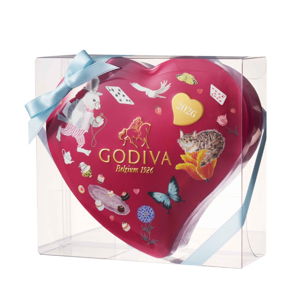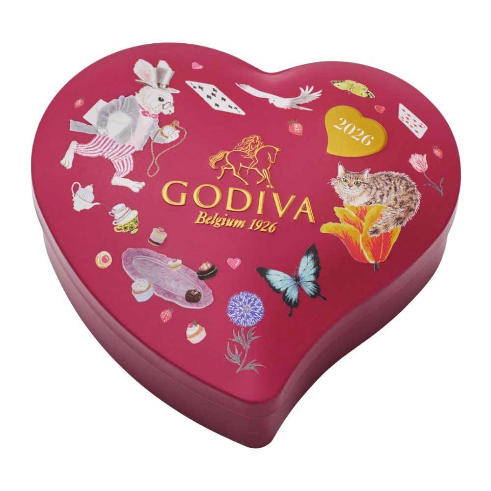 大人かわいいタッチで描かれたチェシャ猫や白うさぎをデザインしたハート形の缶に、ホワイトチョコレートプラリネ、ミルク、ダーク、2026年バレンタインより新登場のダーク ストラッチャテッラのG キューブ チョコレートを詰め合わせました。