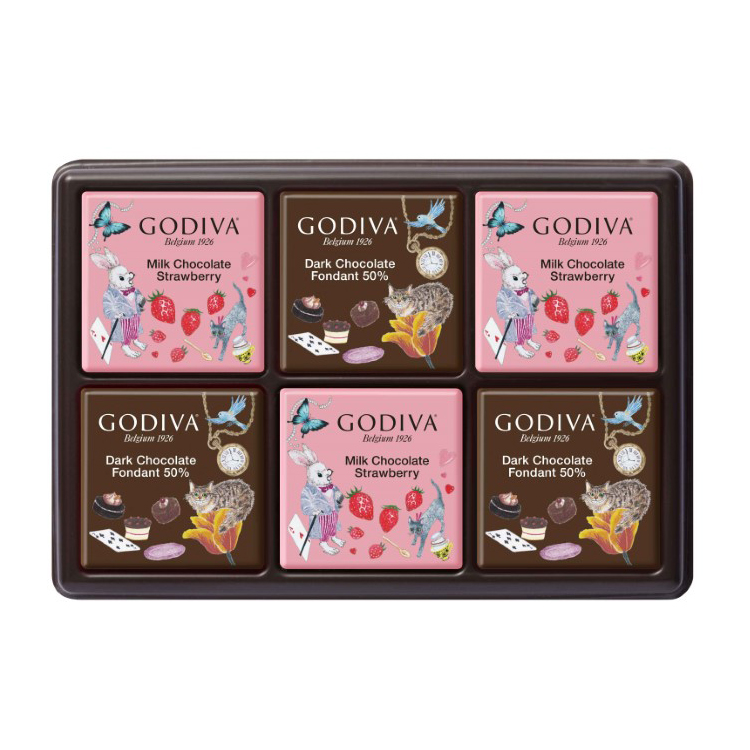 ストロベリー風味のミルクチョコレートとダークチョコレートフォンダンフレーバーのカレを、チェシャ猫や白うさぎを描いたオリジナルのラッピングで包みました。