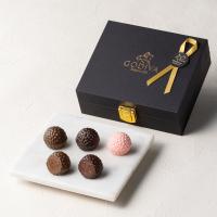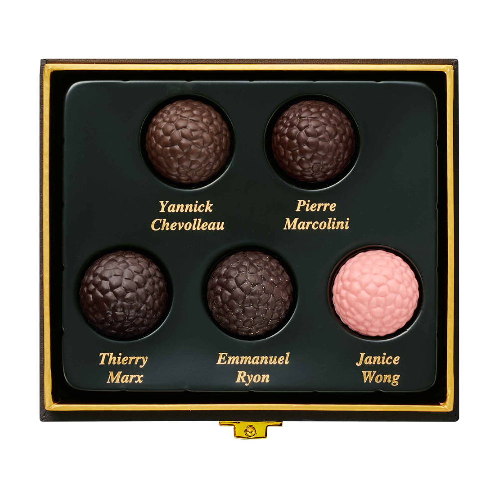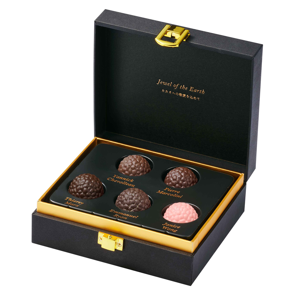 ひと粒ごとにそれぞれのスターシェフの感性輝く、カカオの深い味わい。それらを、真っ黒な黒トリュフのようなシックな箱に詰め、特別な5粒のアソートとしてお届けします。