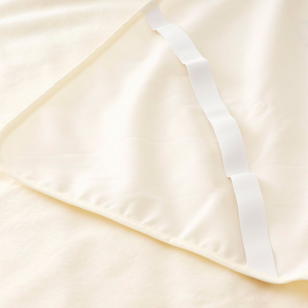 メリノウールをパイル部分に使用しました。ウール素材は吸湿性や放湿性、保温性があるため快適にお休みいただけます。四方ゴムバンド付きで、ベッドや敷ふとんでもお使いいただけます。