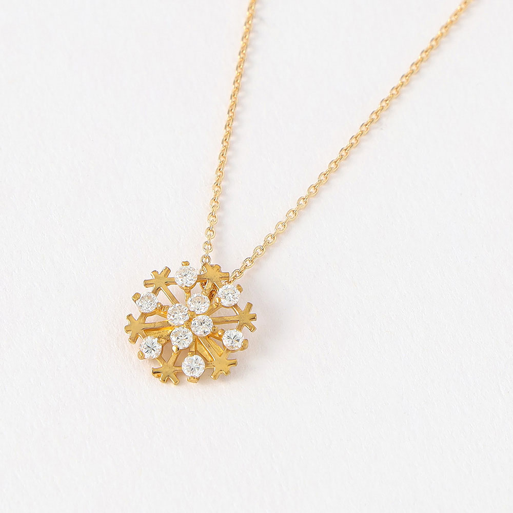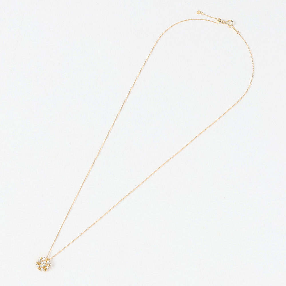 胸元にきらめく純真な輝き。純金の雪の結晶モチーフに10石のダイヤモンド(計約0.2ct)を丁寧にあしらったペンダントです。長さ50cmの18金チェーンはフリーアジャスター付きでお好みの長さに自在に調整でき、様々なお洋服に合わせやすいのも魅力です。