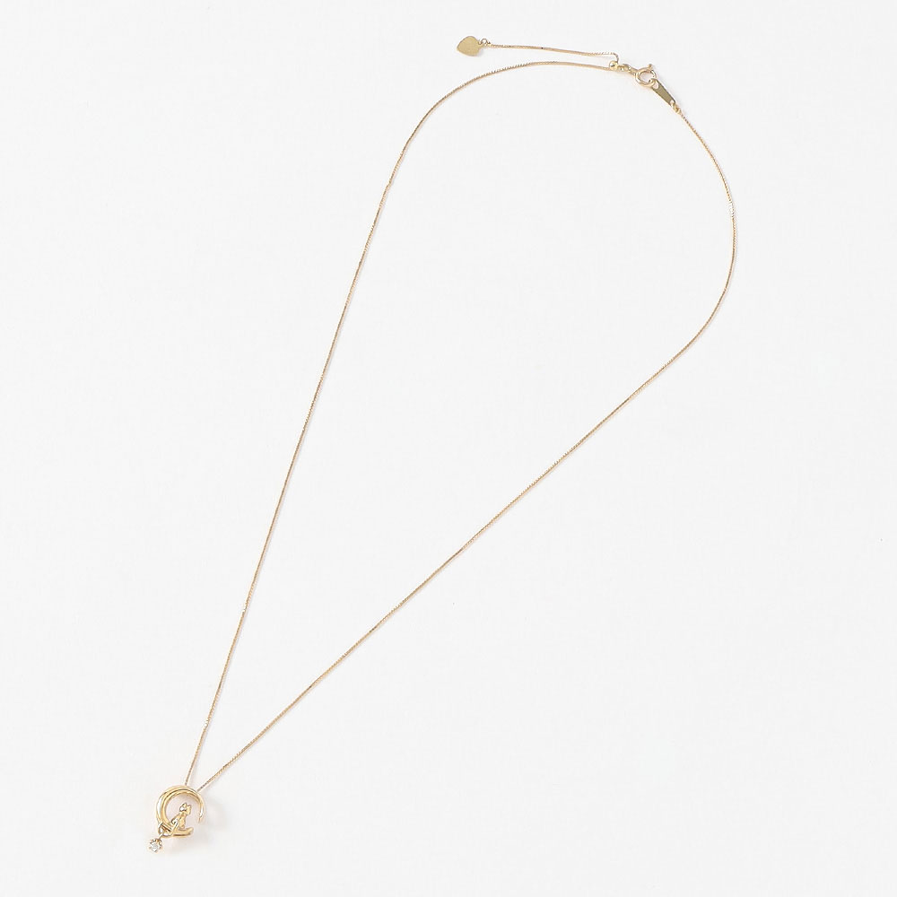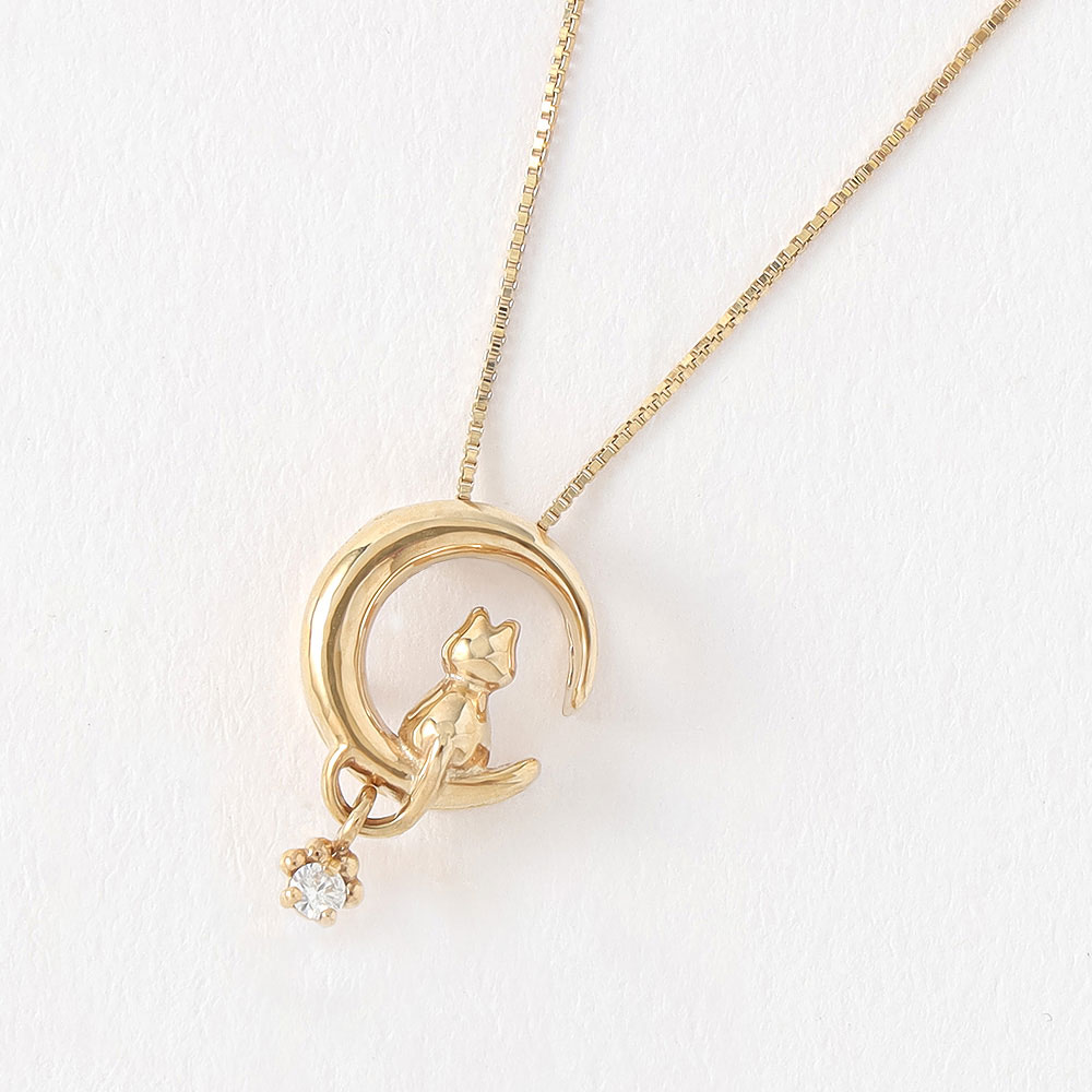 三日月と子猫に癒されるスイングダイヤペンダント。しっぽの先のダイヤは高度な技でわずかな体の動きでスイングする構造にセットされ、キラキラとダイヤが輝きます。チェーンは最長45cmまで長さを自由に調節できるスライド金具付です。