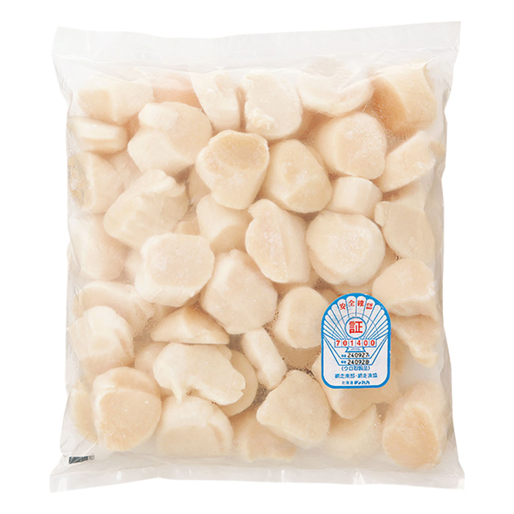 北海道産のホタテ。割れなどの不揃いな物があるため、味は変わらずお買得です。自然解凍してお刺身やバター焼きなどで。