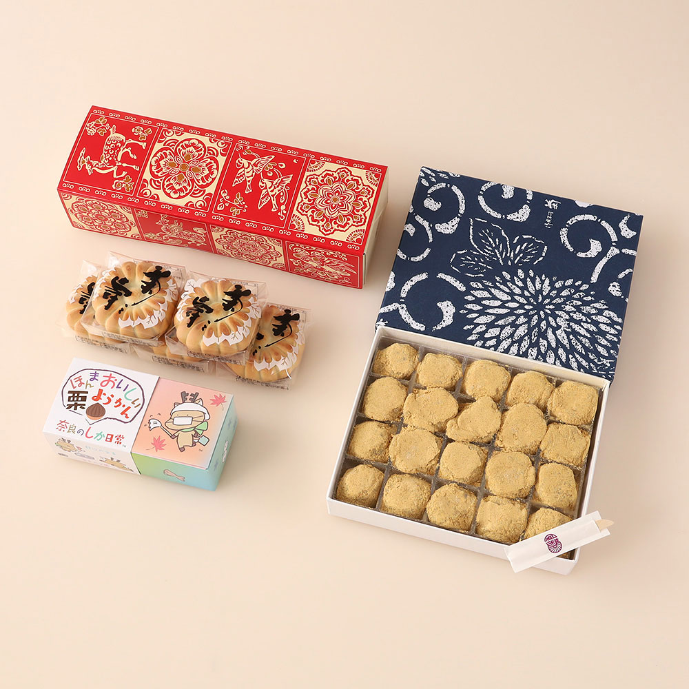 奈良の大和郡山城主 豊臣秀長公から兄の秀吉公をもてなす茶会に珍菓を作るように命ぜられ献上し、子守歌にも唄われ400年続く奈良名物「御城之口餅(おしろのくちもち)」、エアーラインのファーストクラス採用品の黄身餡洋風焼菓子「菊之寿(きくのことぶき)」、奈良の鹿キャラクターが奈良の行事を案内するパッケージに入った栗羊羹「奈良のしか日常」と、奈良で一番古い老舗菓子店の福袋です。
