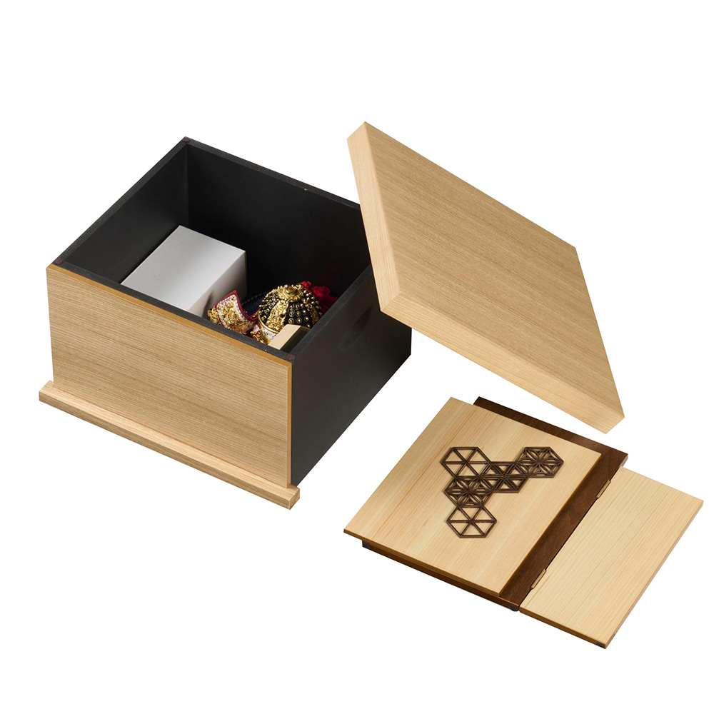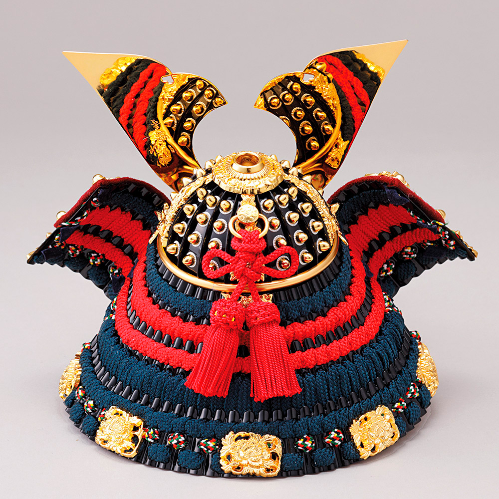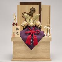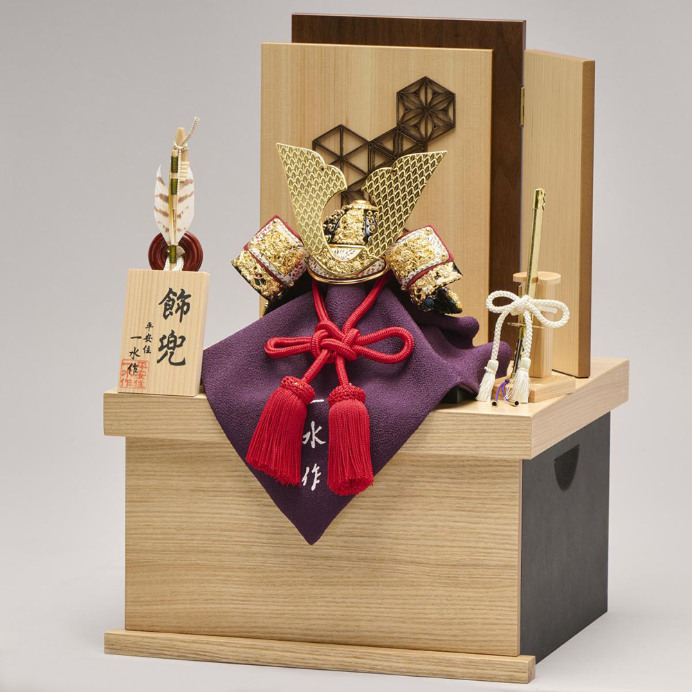 屏風に縁起物のレーザー彫りが施し、コンパクトながら華やかで重厚感のある兜をセットしました。