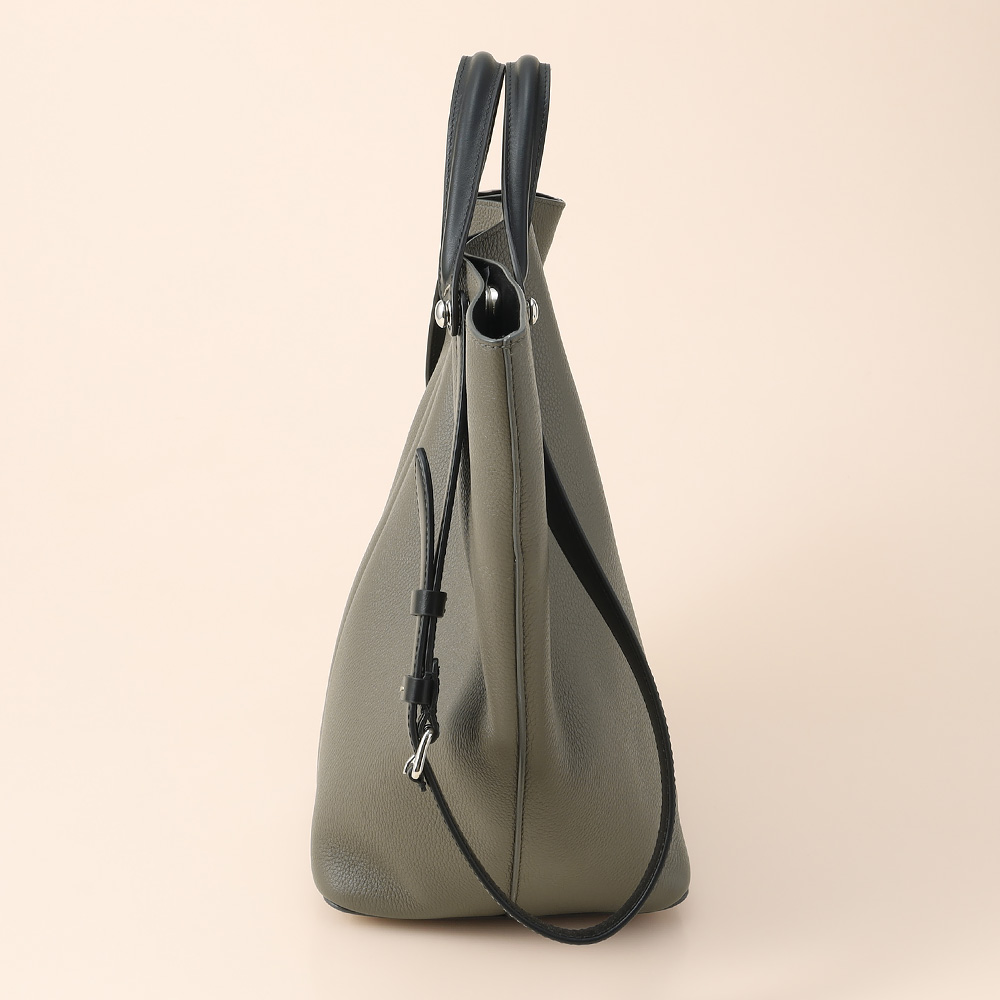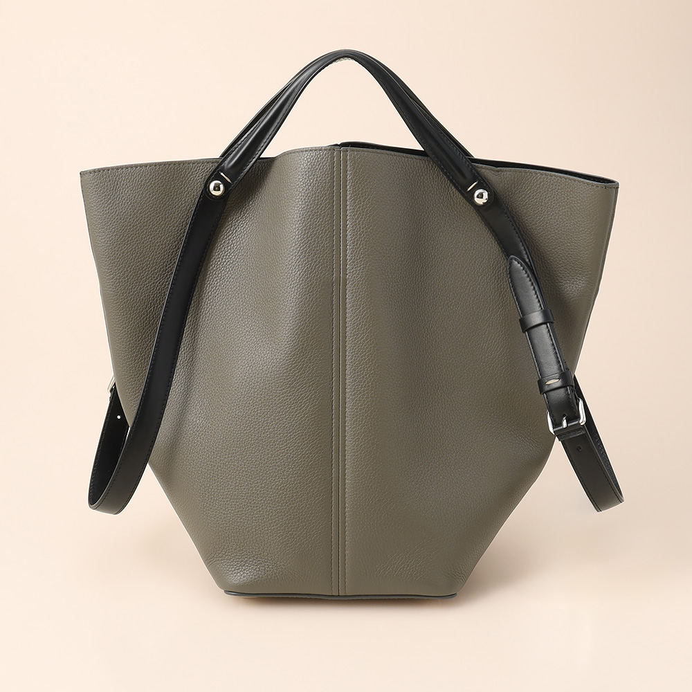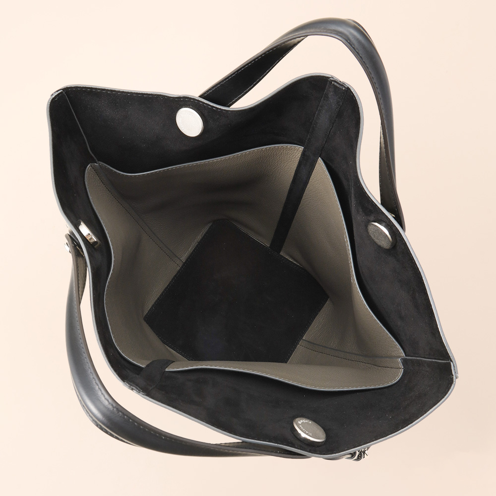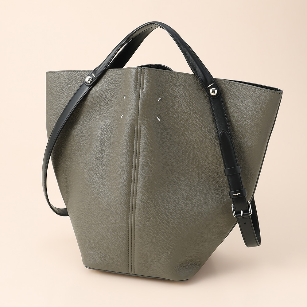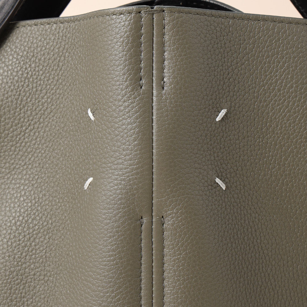 クラシックな革細工と洗練されたラインが特徴のハンドバッグ。底面のスタッズにより自立可能、インナーにはロゴがあしらわれ、背面にはメゾン・マルジェラのシグネチャーである4つのステッチが施されています。