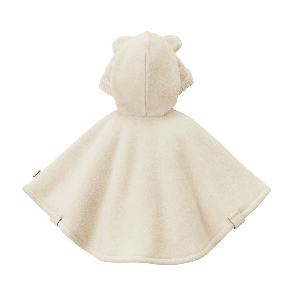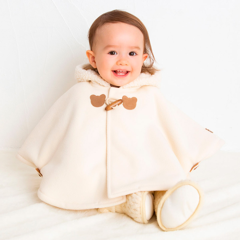 ベビーの時期におすすめの防寒アイテム「マント」。上品な印象のダッフル風デザインがかわいらしく、人気のアイテムです。ちょこんとお座りした姿や、よちよち歩く姿など、成長に合わせていろいろな可愛らしさを見せてくれます。表地には保温性に優れたやわらかなフリース素材を、裏地には暖かいボアフリース素材を使用。2つの素材を接着して一体化した生地は、軽くて着心地がよく、ふんわりあたたか。袖を通さずにさっと羽織れるデザインなので、首がすわる3カ月ごろから2歳ごろまで長くご使用いただけます。はじめてのアウターとしてはもちろん、おでかけ時のブランケット代わりにもぴったり。お箱入りなので、出産祝いやお誕生日プレゼントなどのギフトにもおすすめです。