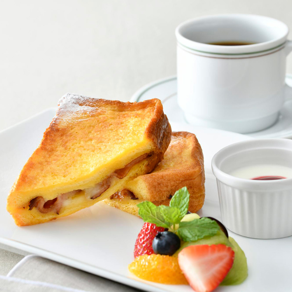 「モンテクリストサンド」は、ふわふわのフレンチトーストにチーズとベーコンを挟んで焼き上げた、ホテルニューグランドの一番人気の朝食メニューです。