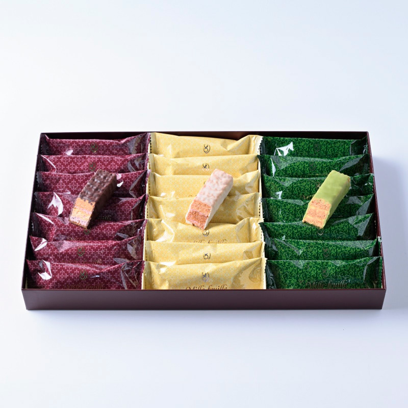 スウィートブルーベリーは、濃厚でほろ苦いショコラにブルーベリーの爽やかな酸味が寄り添う、洗練された味わい。ホワイトストロベリーは、ミルク感あふれるホワイトチョコレートに、いちごの甘酸っぱさが華やかさを添えます。柚子抹茶は、抹茶の深みと、ふわりと広がる柚子の香りが織りなす、和の余韻。それぞれの果実の芳醇な風味を、繊細なパイ生地とまろやかなショコラで丁寧に包み込みました。