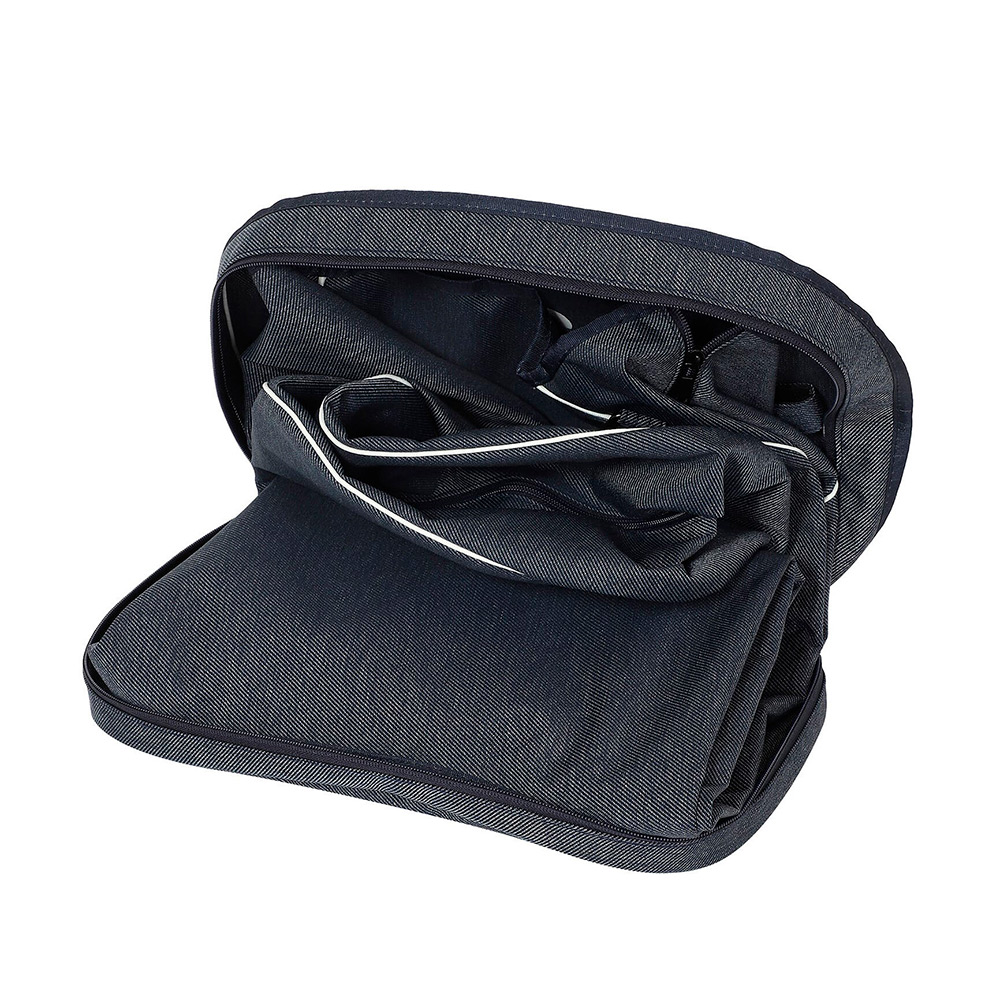 使用時のサイドポケット部分にコンパクトに収納できる、丈夫なデニム調ポリエステル素材のトラベルカバー。底部が開いた仕様でキャディバッグを立てたまま簡単に装着できます。配送伝票を入れるクリアポケット付き。