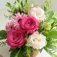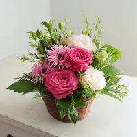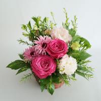華やかなピンク色のバラと、エレガントなトルコキキョウに可愛らしいガーベラの調和が心地よいアレンジメント。花瓶の用意が必要なく、そのまま飾れる手軽さと飾りやすいサイズ感が魅力です。日常のちょっとしたお祝いや、元気を届けたいときにぴったりです。