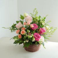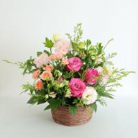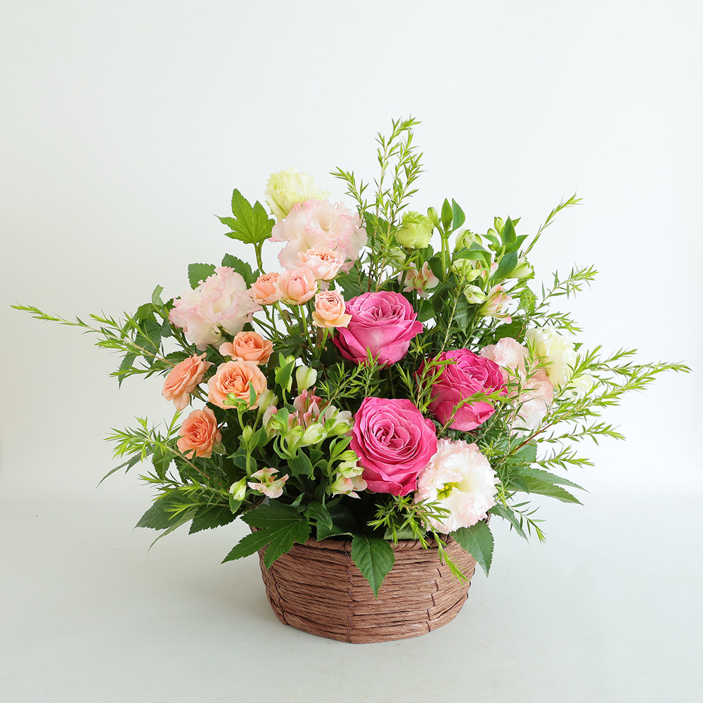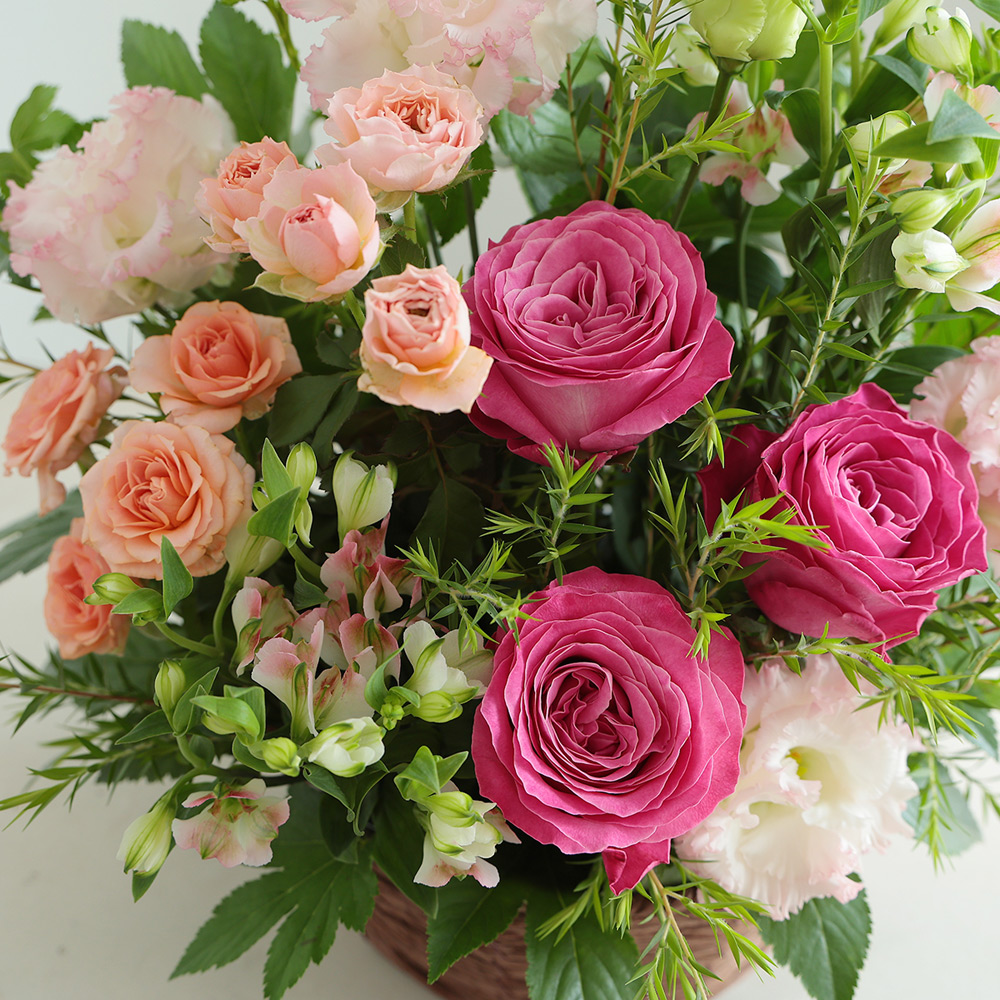 華やかなピンク色のバラと、エレガントなトルコキキョウのアレンジメント。花瓶の用意が必要なく、そのまま飾れる手軽さが魅力です。自分へのご褒美にも、友人への感謝の気持ちにも、上質ながら手に取りやすい華やかさです。