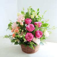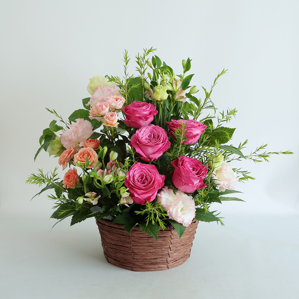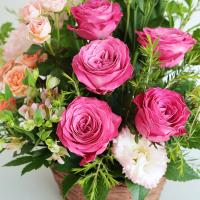 華やかなピンク色のバラと、エレガントなトルコキキョウのアレンジメント。花瓶の用意が必要なく、そのまま飾れる手軽さが魅力です。大切な記念日や感謝の気持ちを、より一層際立たせたい時におすすめです。