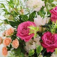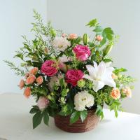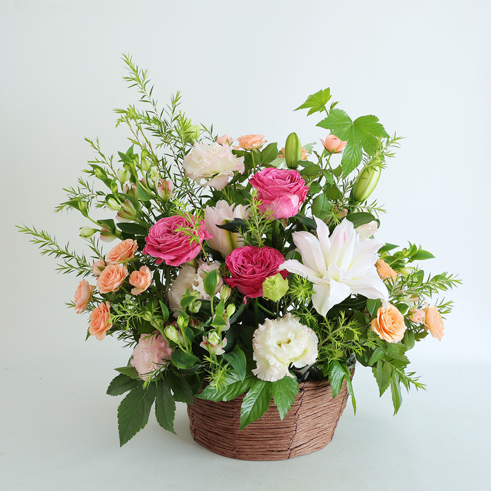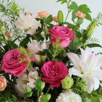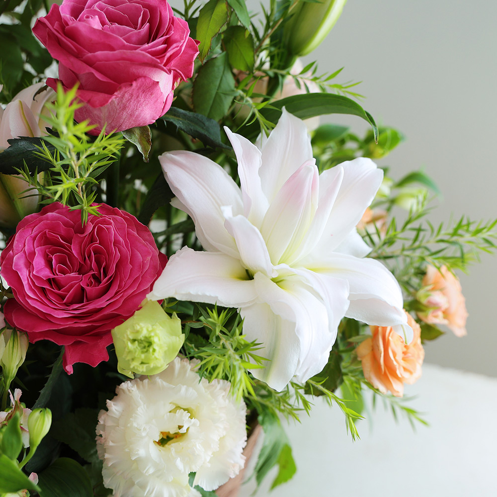 季節の花材を生かした、特別なアレンジメント。八重のユリをメインに、華やかなピンクのバラを贅沢に使用しました。大切なお祝いの場面を華やかに彩ります。ユリはつぼみの状態で出荷させていただく場合がございます。