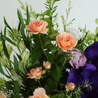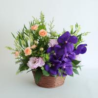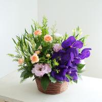 しっとりとした質感の紫の花材でまとめた、ほどよく華やかなアレンジメント。花瓶の用意が必要なく、そのまま飾れる手軽さが魅力です。空間を華やかに演出しつつ、上質さを感じさせるアレンジメントです。