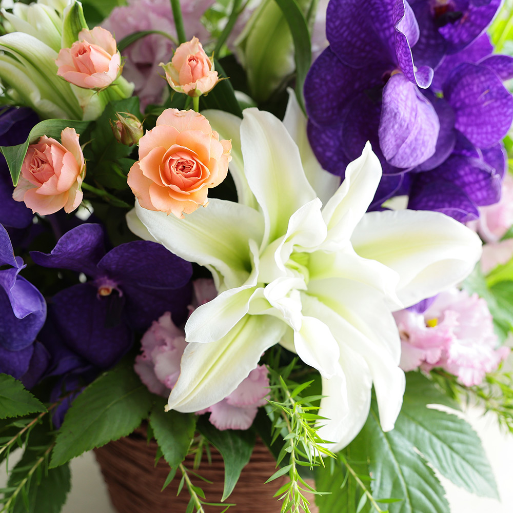 八重百合、バンダ、スプレーバラ、トルコキキョウ、アルストロメリアなど