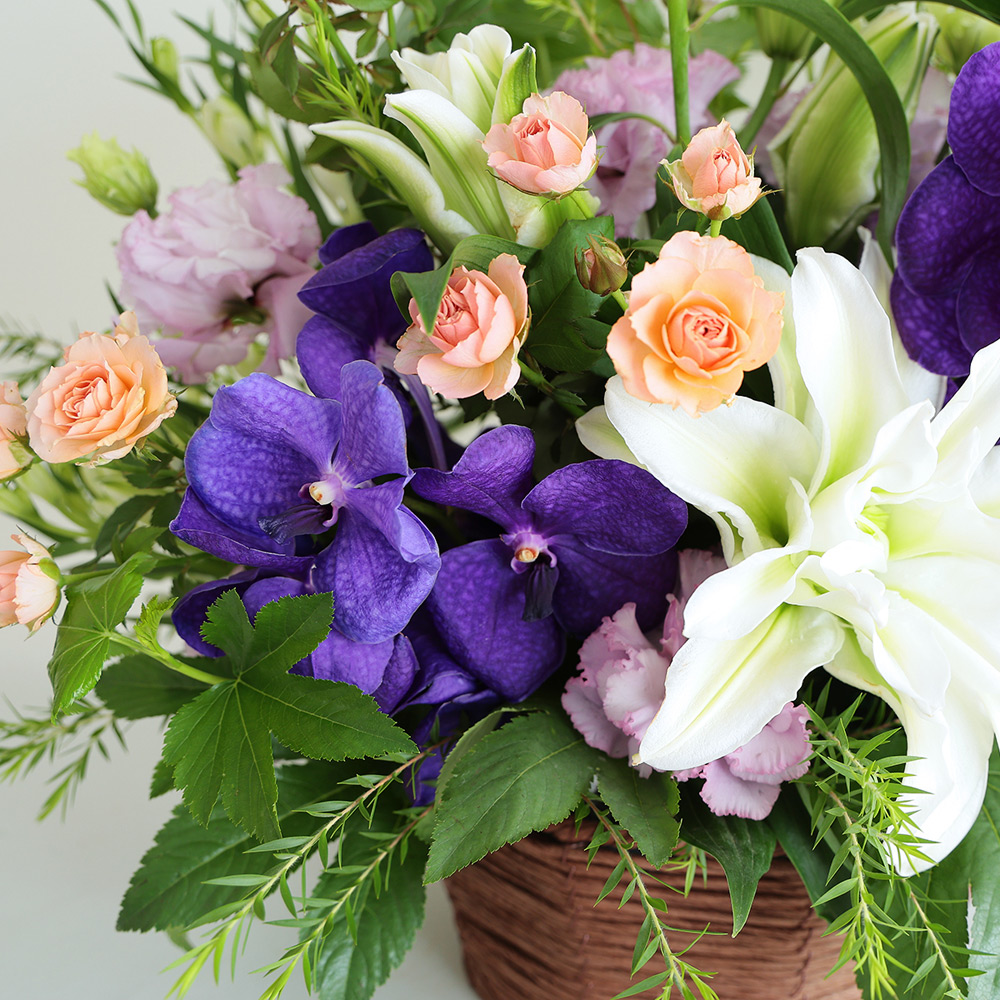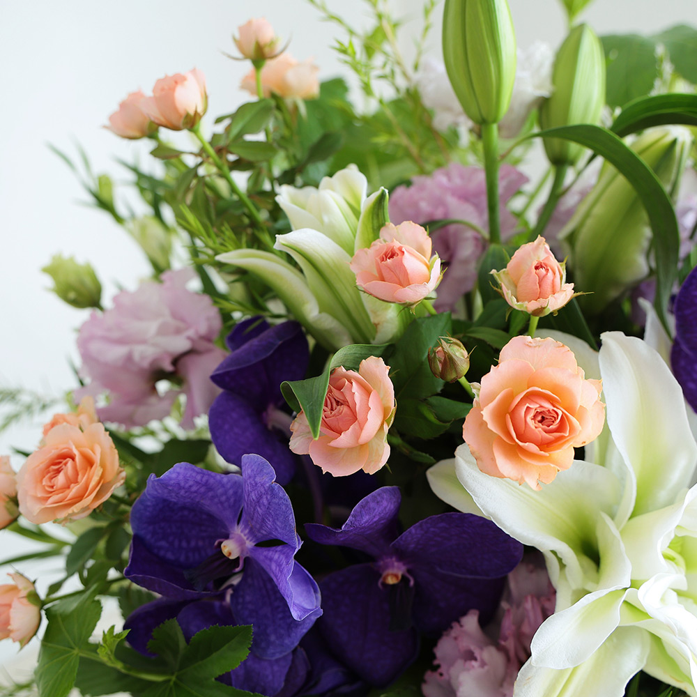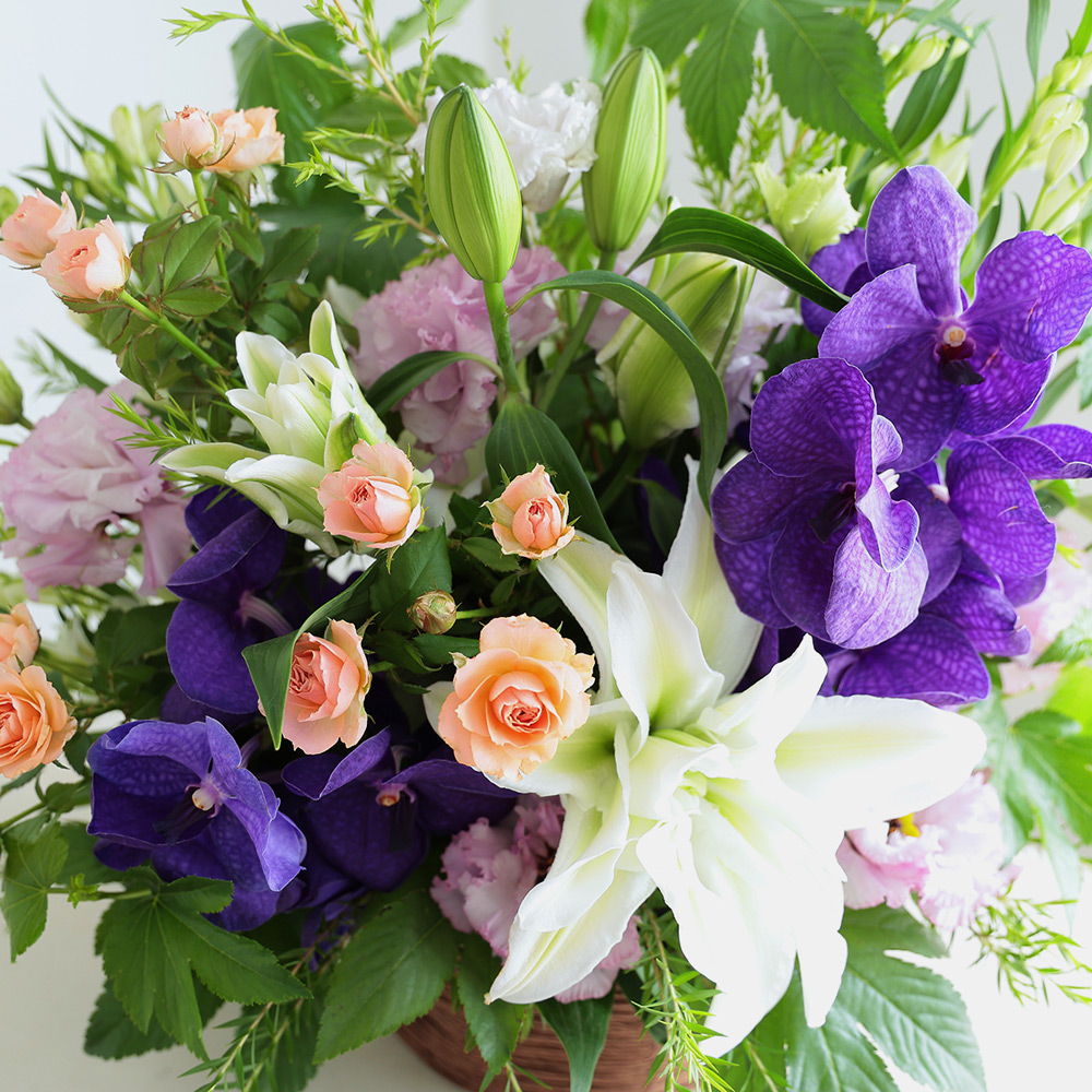 季節の花材を生かした、特別なアレンジメント。八重のユリをメインに、落ち着いた質感のバンダを贅沢に使用しました。ユリはつぼみの状態で出荷させていただく場合がございます。