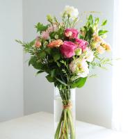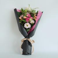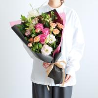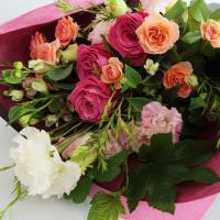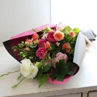 ピンク色のバラと、エレガントなトルコキキョウが華やかな花束。自分へのご褒美にも、友人への感謝の気持ちにも、上質ながら手に取りやすい華やかさです。