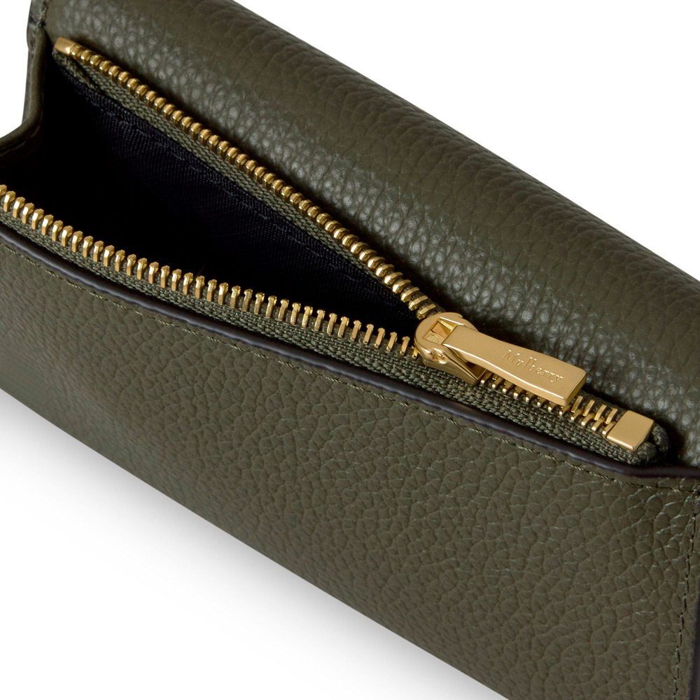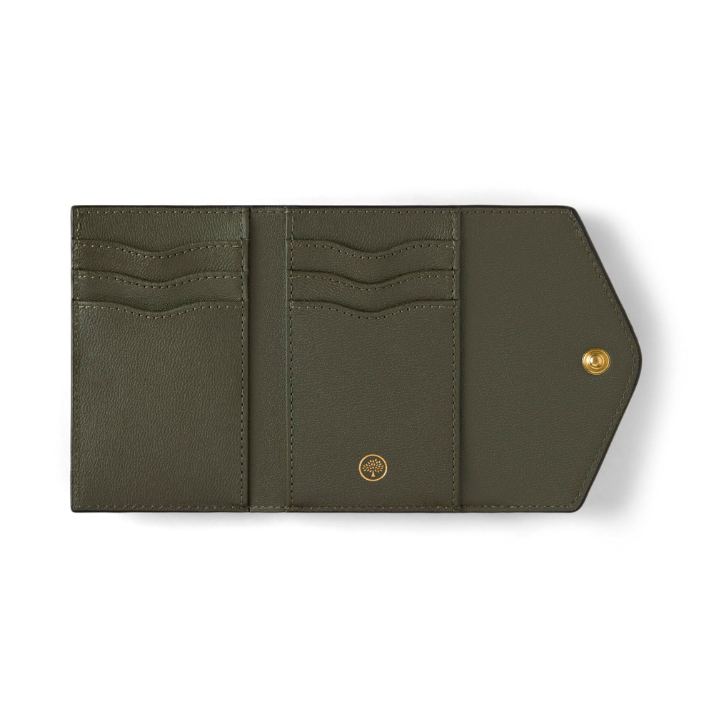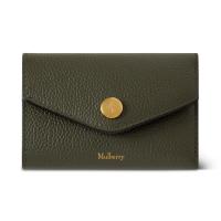 マルベリーロゴが刻印されたスナップボタン付きの折りたたみ式カードウォレット。コンパクトかつ実用的なデザインで、バッグやポケットに入れて持ち運ぶのに便利です。