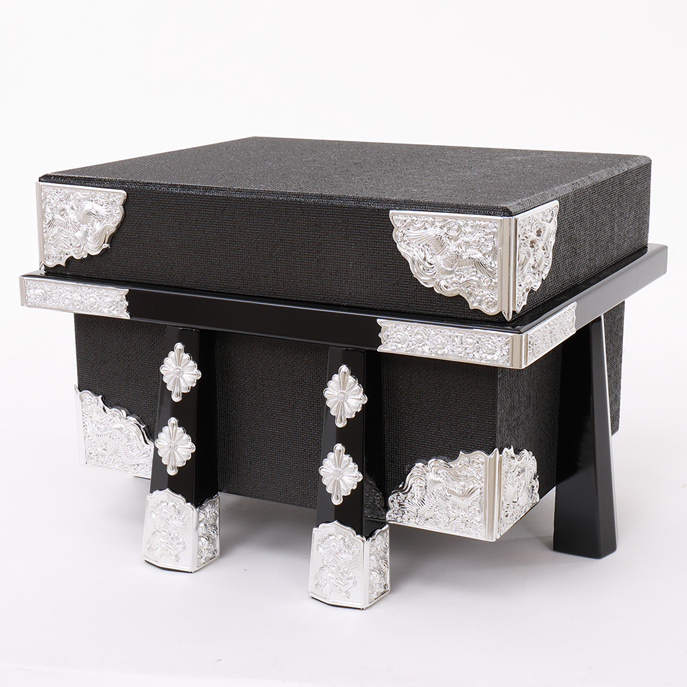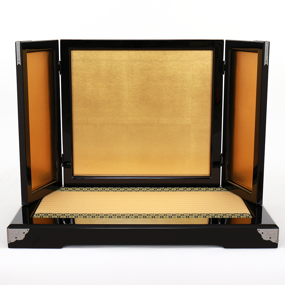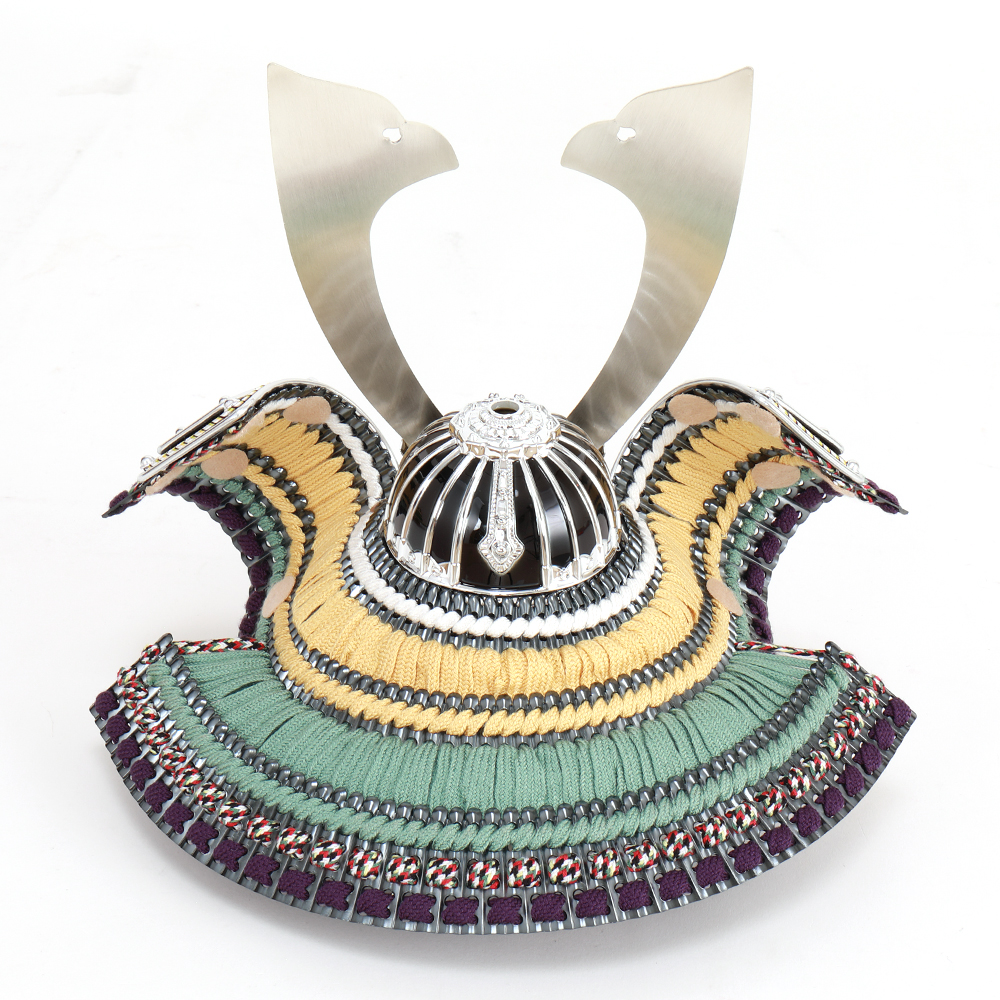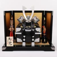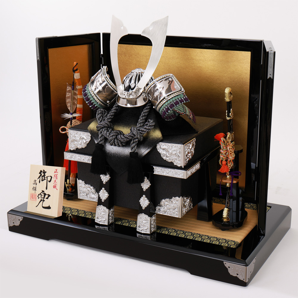 雄々しい武将の姿を象徴する、兜飾り。シックなシルバー色の飾り金具を施した兜です。金屏風が華やかさを演出しています。