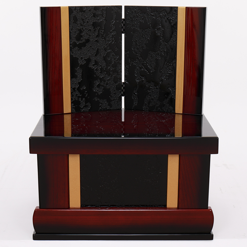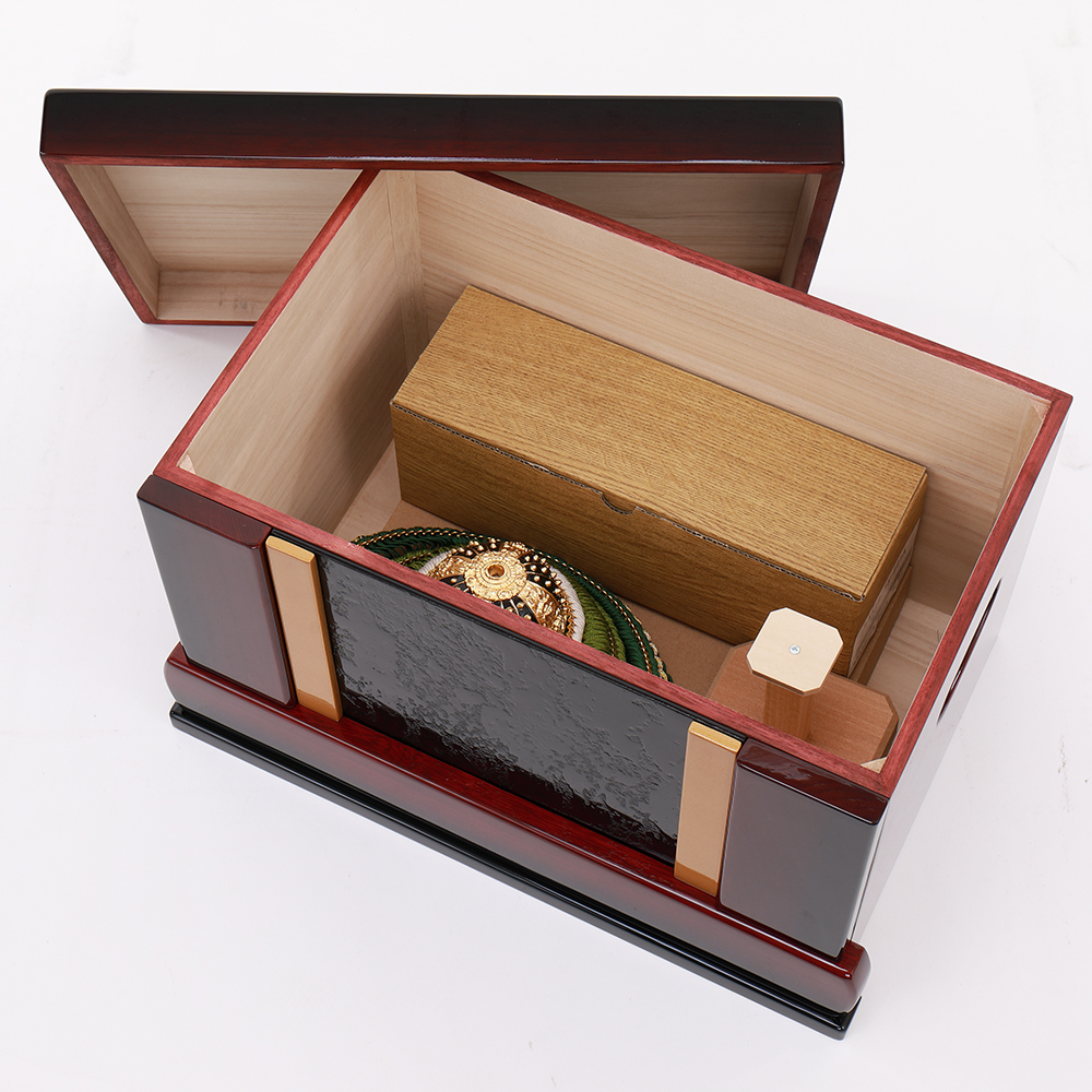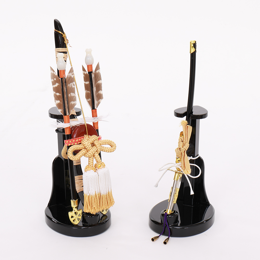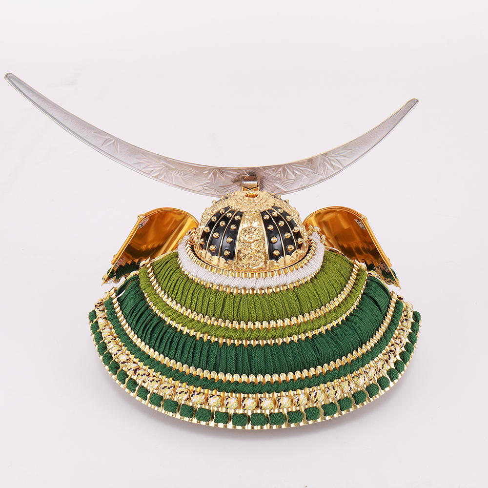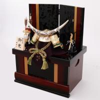 飾り台の中に一式しまえる、コンパクトな兜飾り。兜は萌黄威しです。三日月の前立てに竹と雀の柄を施した、豪華な兜飾りです。